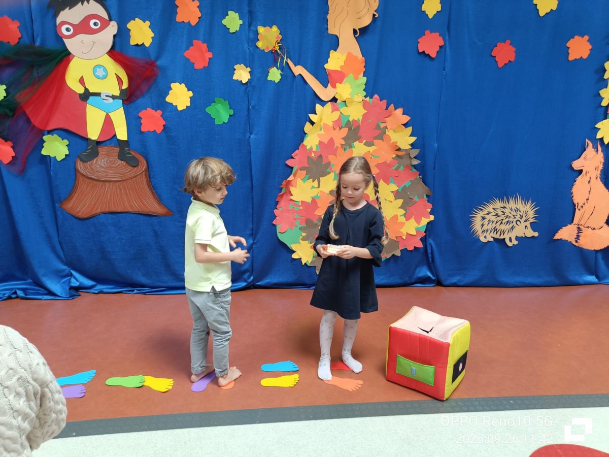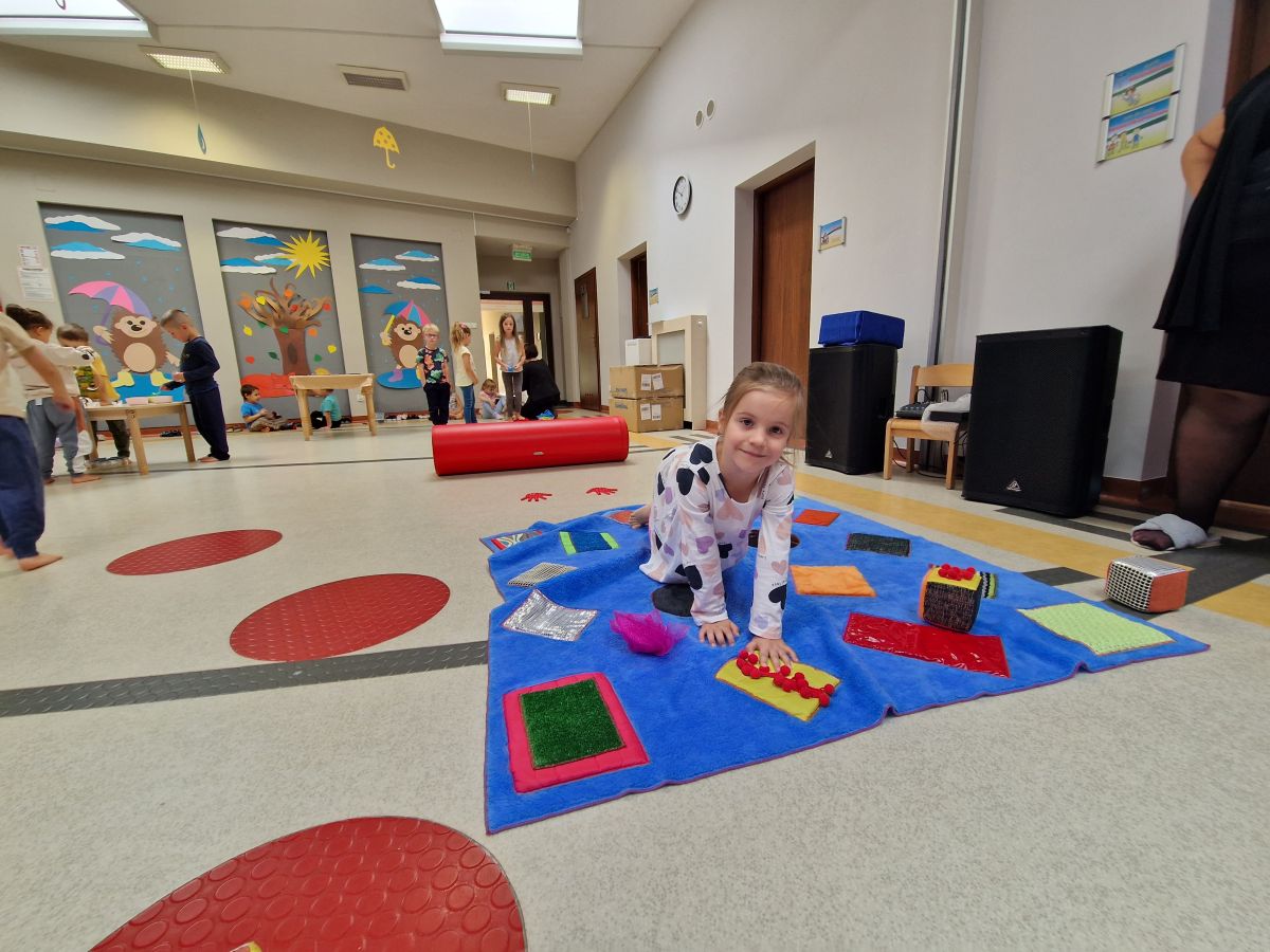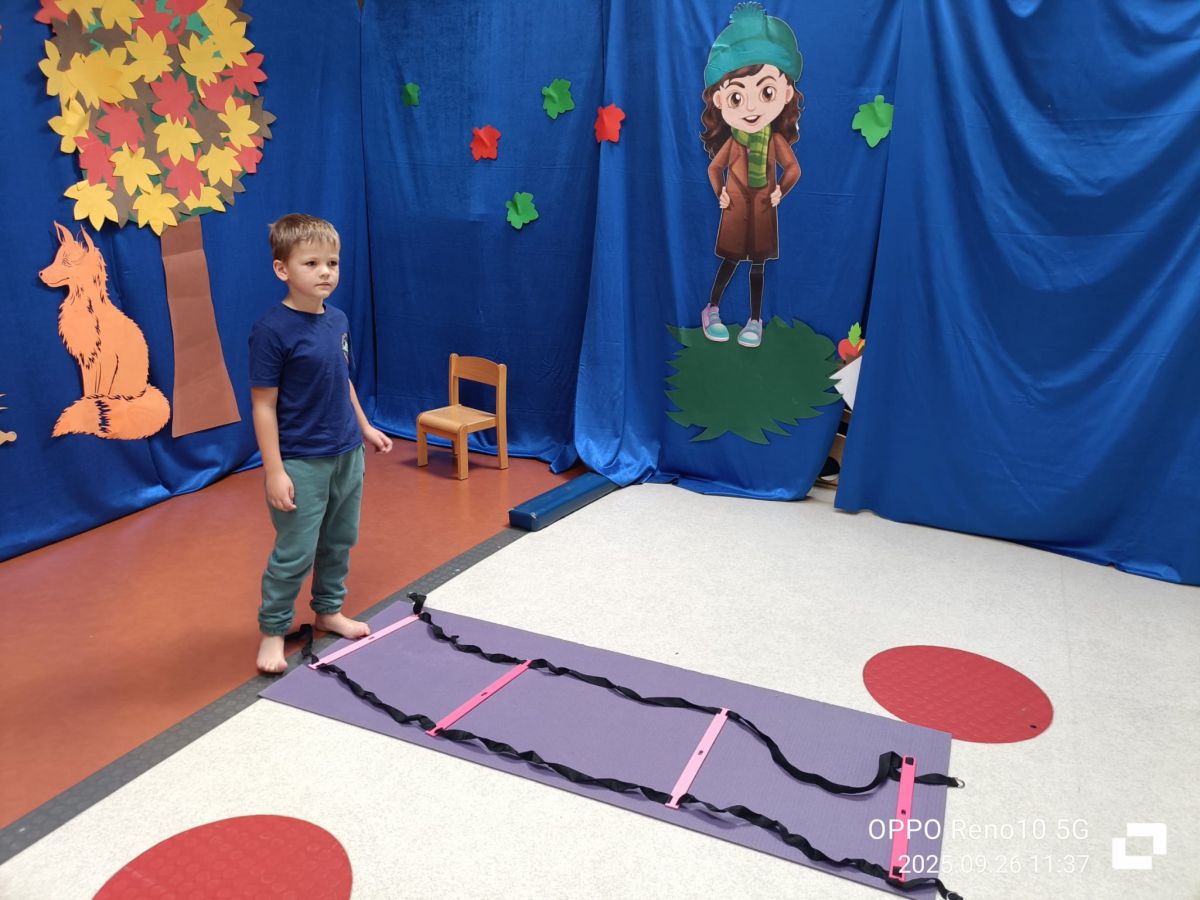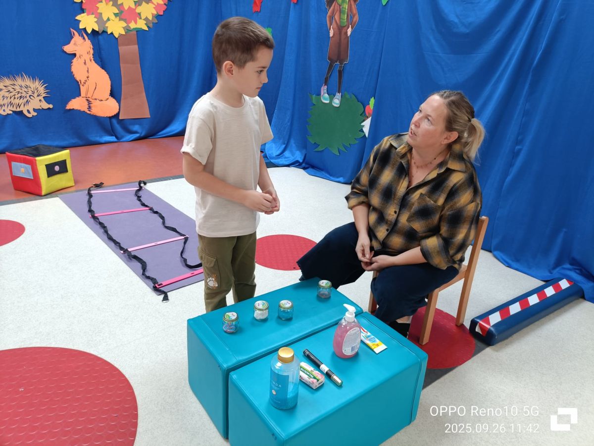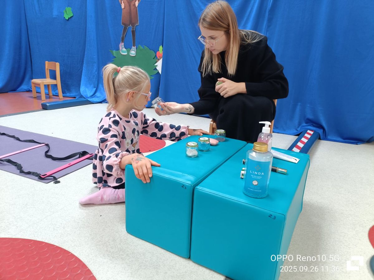 W dniu 26 września 2025 roku w Naszym Przedszkolu odbyły się zajęcia sensoryczno-motoryczne „Moje ciało”. Celem tych zajęć było wielozmysłowe poznawanie świata, czyli odbieranie bodźców różnymi zmysłami. Dodatkowo dzieci usprawniały swoje umiejętności motoryczne i manualne. Podczas pokonywania ścieżki sensorycznej przedszkolaki słuchały krótkiego opowiadania o tym jak należy dbać o swoje ciało. Na zajęciach dzieci kolorowały malowankę zbiorową z wykorzystaniem różnokolorowych mazaków; rzucały woreczki do kolorowych kółek w tym samym kolorze; turlały się na wałku gimnastycznym; rozpoznawały za pomocą zmysłu wzroku fakturę i odnajdywały ją na dużej planszy; naśladowały grę na instrumentach muzycznych (kołatki, marakasy, drewienka, tamburyna, janczary); skakały po stopkach w wyznaczonym kierunku; rozpoznawały za pomocą dotyku przedmioty służące do pielęgnacji ciała ukryte w pudełku dotykowym (szczoteczka do zębów, szczoteczka do ciała, mydło, pumeks, gąbka do mycia ciała, pasta do zębów, żel do mycia ciała, krem); wykonywały skoki po drabinkach; różnicowały zapachy kosmetyków do ciała i dopasowywały przedmioty do zbiorów (mydło w kostce, mydło w płynie, pasta do zębów, perfumy, sól do kąpieli); pokonywały krótką ścieżkę sensoryczną. Na zakończenie wykonywały swój instrument muzyczny z wykorzystaniem słoiczków, mas sypkich (kasza, ryż, fasola, amarantus), który ozdabiały kolorowymi naklejkami.