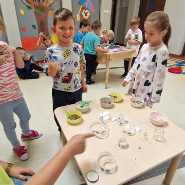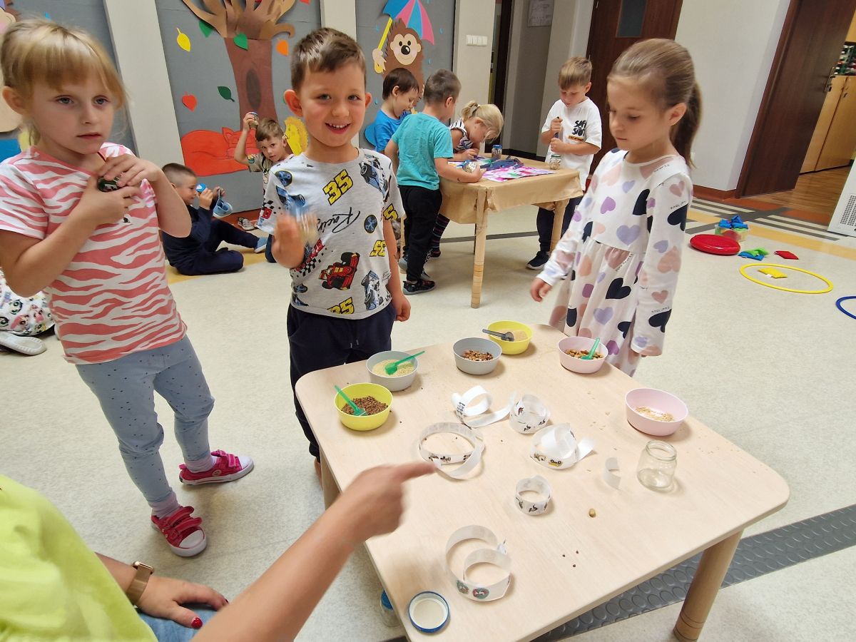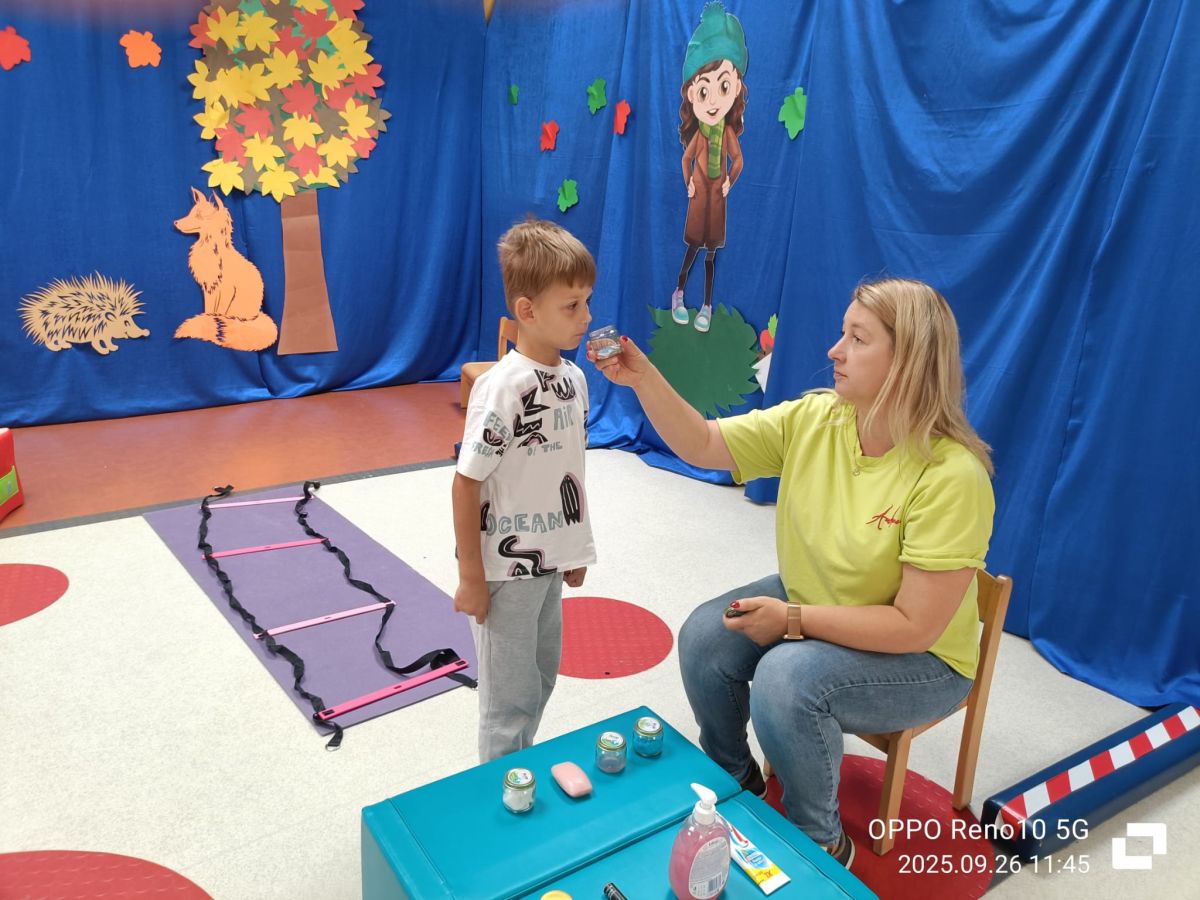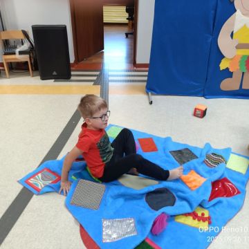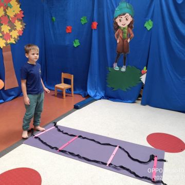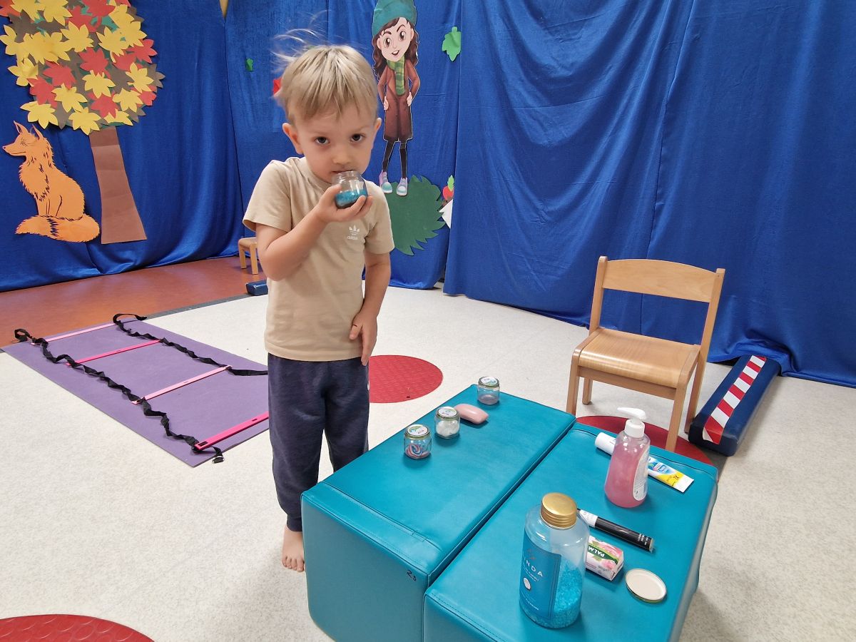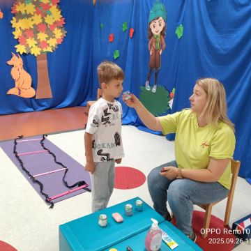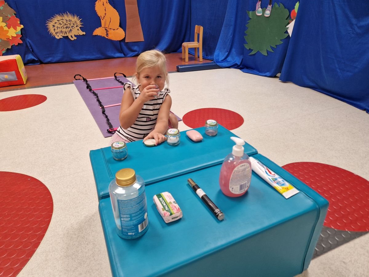 W dniu 26 września 2025 roku w Naszym Przedszkolu odbyły się zajęcia sensoryczno-motoryczne „Moje ciało”. Celem tych zajęć było wielozmysłowe poznawanie świata, czyli odbieranie bodźców różnymi zmysłami. Dodatkowo dzieci usprawniały swoje umiejętności motoryczne i manualne. Podczas pokonywania ścieżki sensorycznej przedszkolaki słuchały krótkiego opowiadania o tym jak należy dbać o swoje ciało. Na zajęciach dzieci kolorowały malowankę zbiorową z wykorzystaniem różnokolorowych mazaków; rzucały woreczki do kolorowych kółek w tym samym kolorze; turlały się na wałku gimnastycznym; rozpoznawały za pomocą zmysłu wzroku fakturę i odnajdywały ją na dużej planszy; naśladowały grę na instrumentach muzycznych (kołatki, marakasy, drewienka, tamburyna, janczary); skakały po stopkach w wyznaczonym kierunku; rozpoznawały za pomocą dotyku przedmioty służące do pielęgnacji ciała ukryte w pudełku dotykowym (szczoteczka do zębów, szczoteczka do ciała, mydło, pumeks, gąbka do mycia ciała, pasta do zębów, żel do mycia ciała, krem); wykonywały skoki po drabinkach; różnicowały zapachy kosmetyków do ciała i dopasowywały przedmioty do zbiorów (mydło w kostce, mydło w płynie, pasta do zębów, perfumy, sól do kąpieli); pokonywały krótką ścieżkę sensoryczną. Na zakończenie wykonywały swój instrument muzyczny z wykorzystaniem słoiczków, mas sypkich (kasza, ryż, fasola, amarantus), który ozdabiały kolorowymi naklejkami.