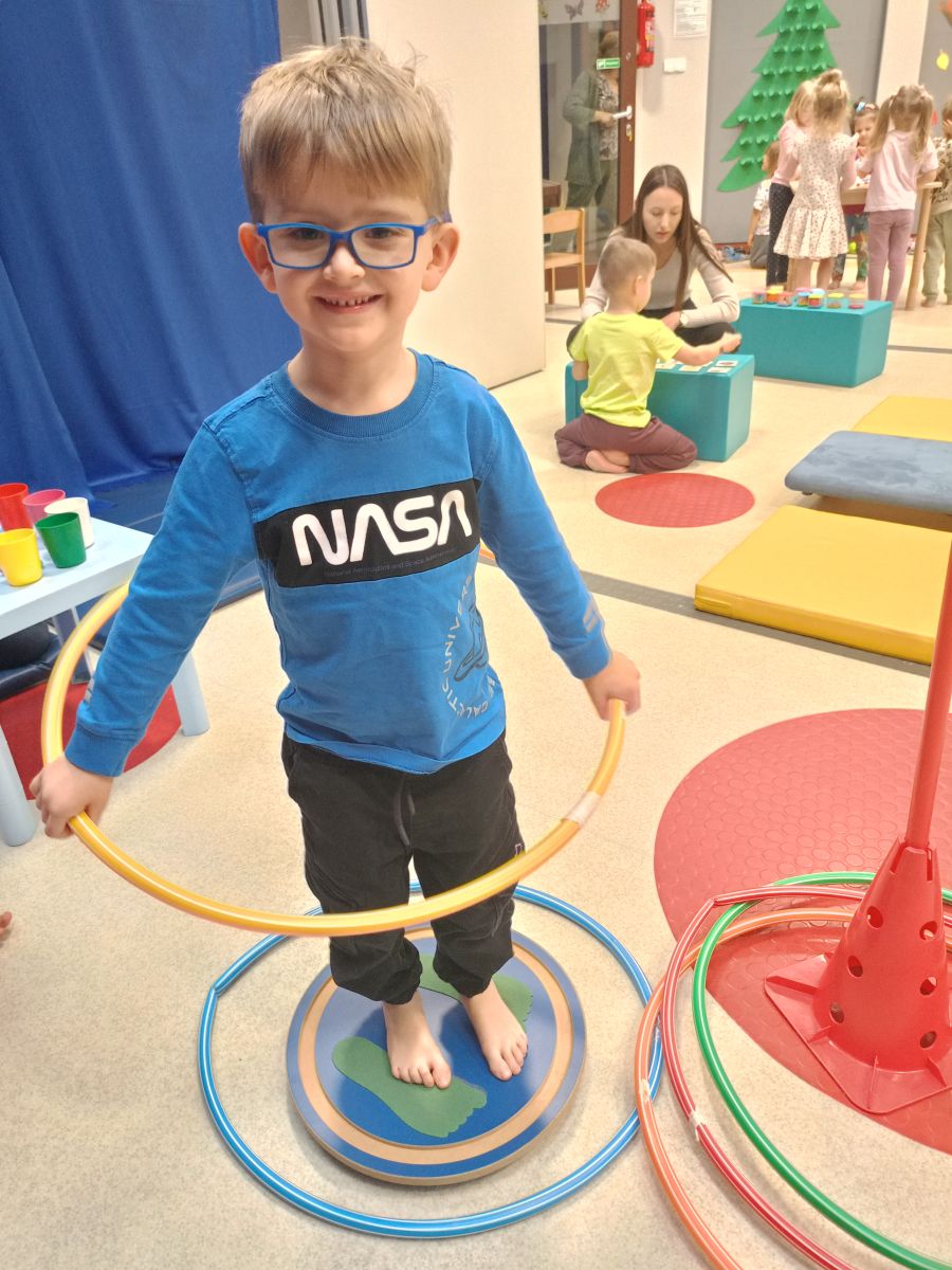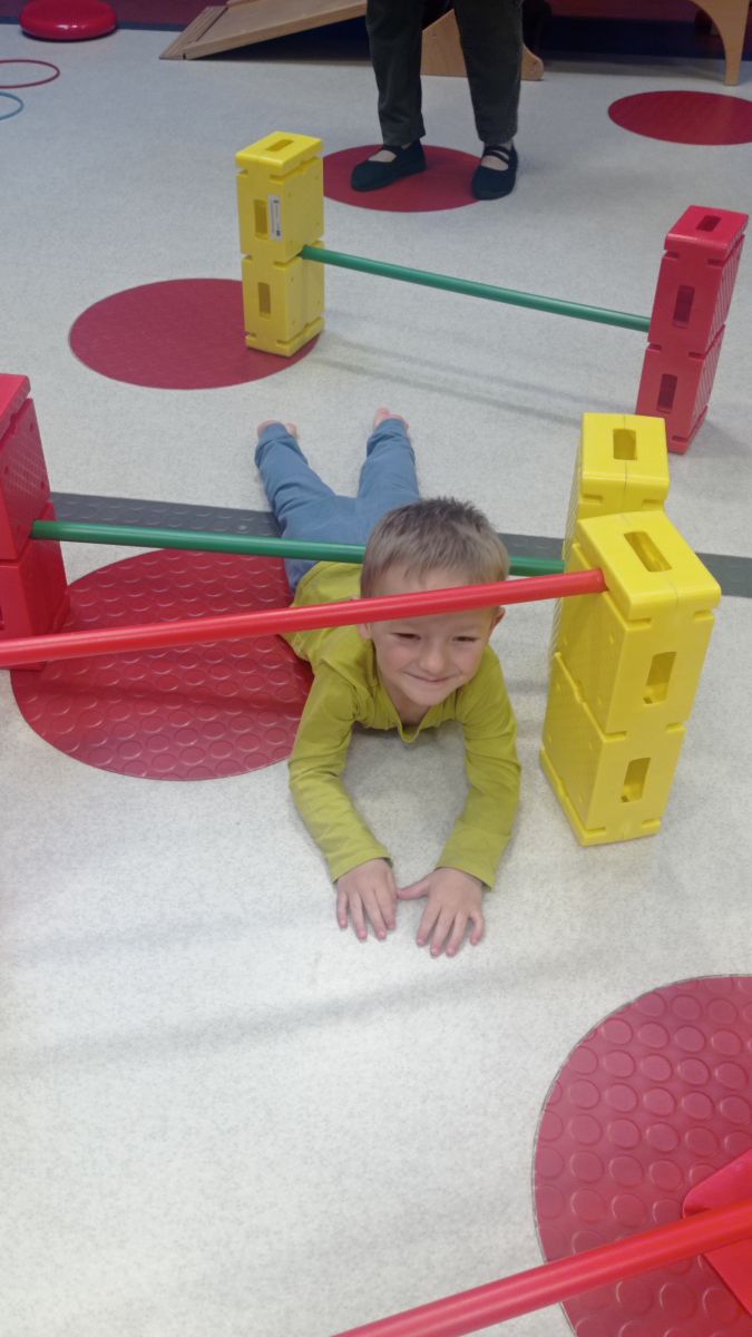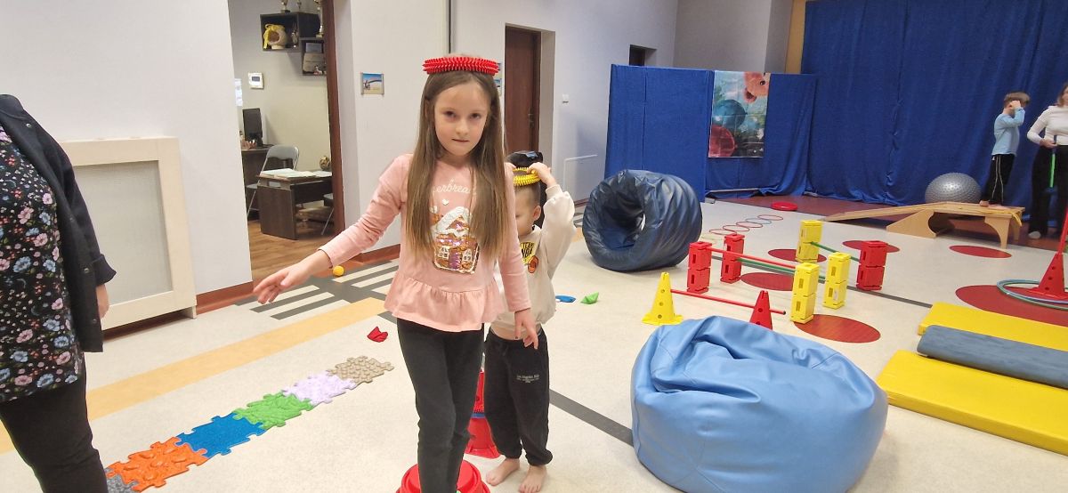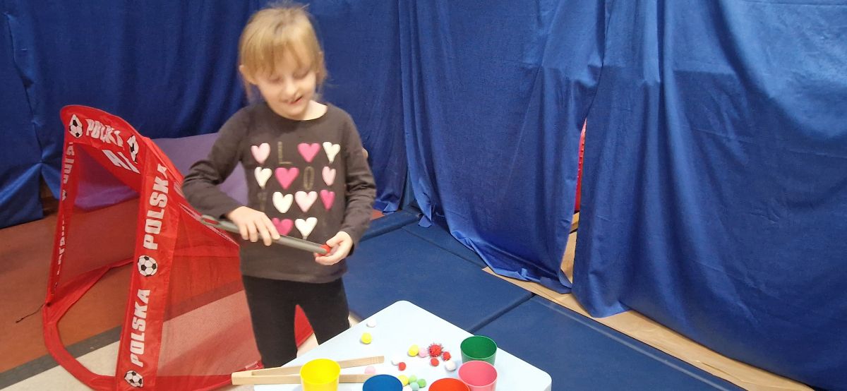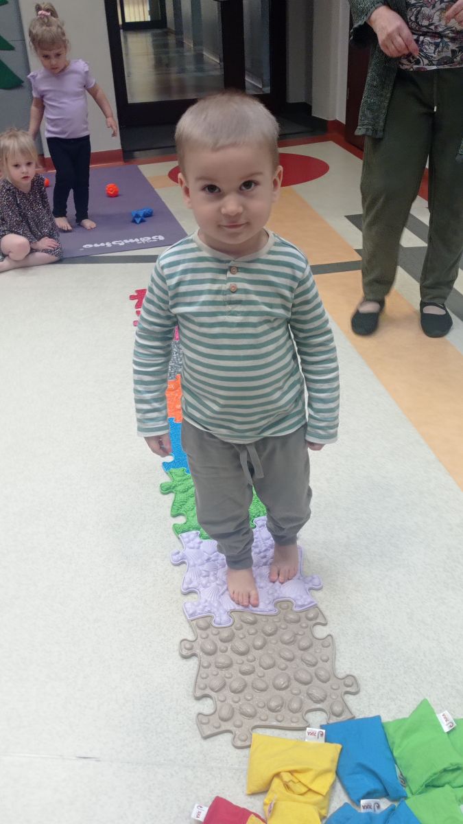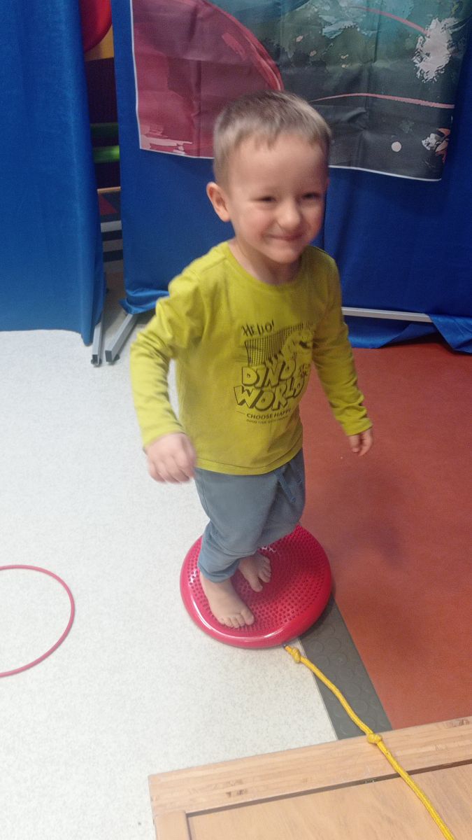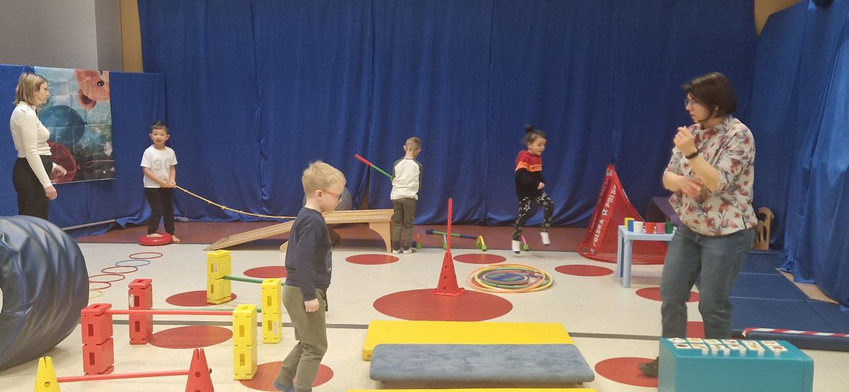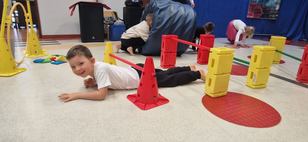 W dniu 24 listopada 2025 roku w Naszym Przedszkolu odbyły się zajęcia sensoryczno-motoryczne „Ruch to zdrowie”. Celem tych zajęć było wielozmysłowe poznawanie świata, czyli odbieranie bodźców różnymi zmysłami. Dodatkowo dzieci usprawniały swoje umiejętności motoryczne, koordynacyjne, równoważne i manualne. Przed wykonaniem ścieżki sensorycznej przedszkolaki wysłuchały krótkiego opowiadania, o tym, jak należy dbać o rozwój fizyczny. Na zajęciach dzieci pokonywały złożony tor przeszkód, podczas którego stymulowały swoje dłonie z użyciem piłeczek sensorycznych o różnym kształcie, wielkości i fakturze; przechodziły po ścieżce fakturowej zakończonej rzutem do celu z wykorzystaniem woreczków gimnastycznych; przechodziły przez obręcz oraz przez beczkę sensoryczną; wsparte na dłoniach i stopach przechodziły po kolorowych kółkach; wchodziły po pochylni wykorzystując linę; za pomocą kija do krykieta i piłeczek trafiały do bramki; segregowały kolorowe piłeczki do pojemników, w tych samych kolorach z wykorzystaniem szczypiec; przekładały obręcz przez całą długość ciała stojąc na berecie sensorycznym i zakładały ją na trzpień; czołgały się pod przeszkodami; przechodziły na czworakach po kołysce równoważnej; rozpoznawały zapachy owoców: gruszka, ananas, wiśnia, pomarańcza, truskawka, kokos i wskazywały rozpoznany owoc na obrazku; manipulowały kostkami sensorycznymi i dobierały je w pary stymulując zmysł słuchu; przechodziły po pufie w dowolny sposób; przechodziły po równoważni z ringiem sensorycznym na głowie; przypinały klamerki od bielizny do twardych przedmiotów: słońce, burak, kaktus, kogut, ptak, marchewka, ryba, królik, muchomor, jeż. W tle słychać było dźwięki muzyki poważnej.