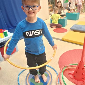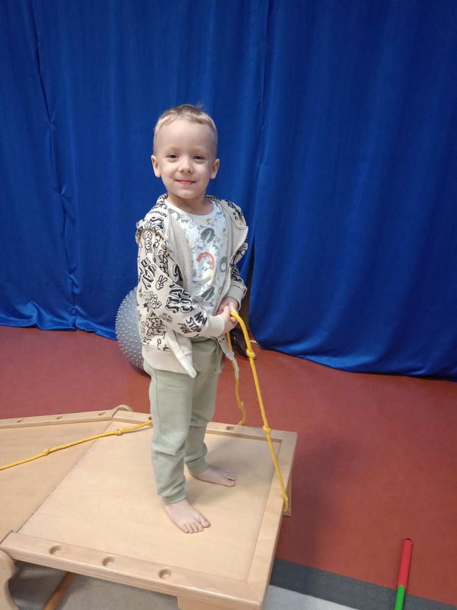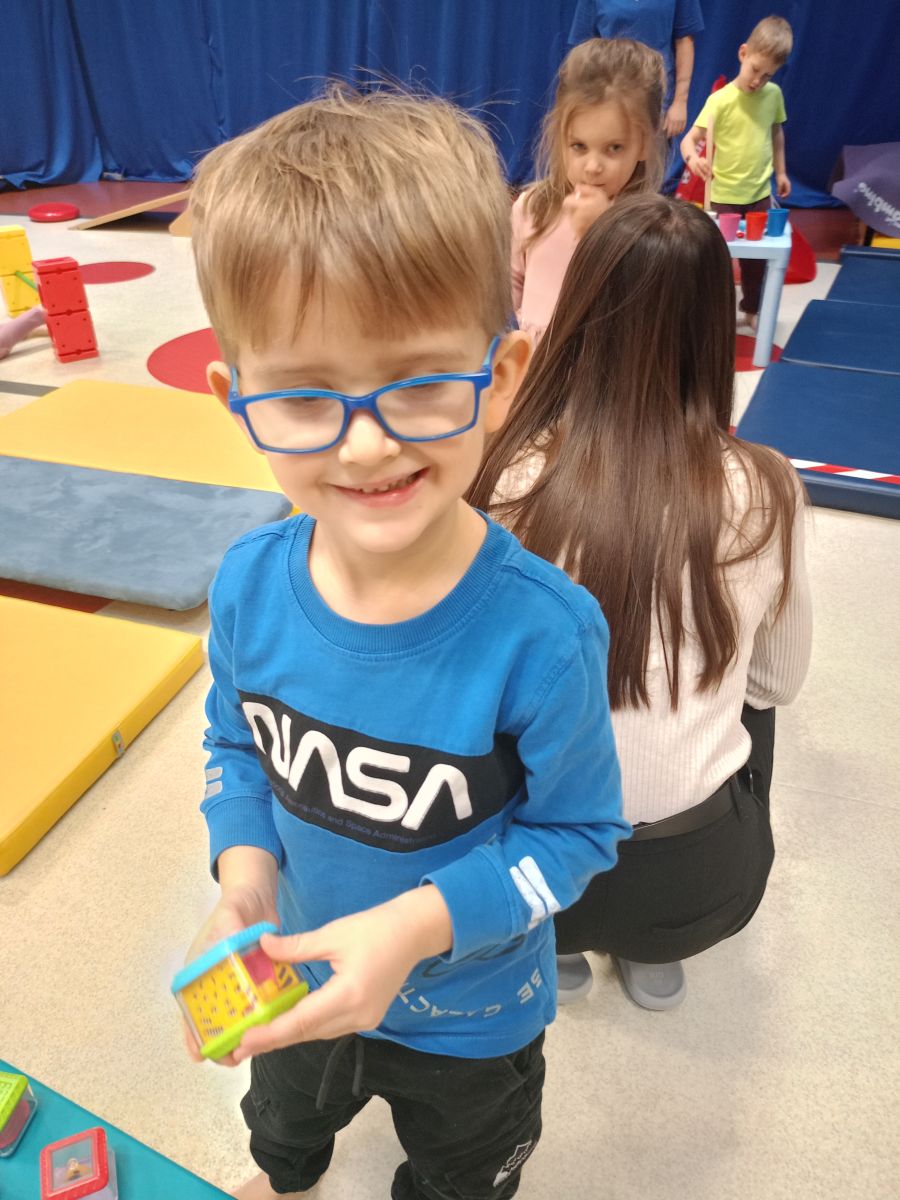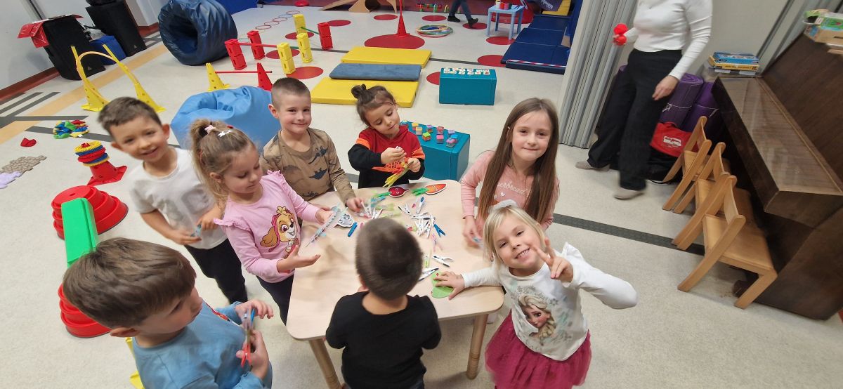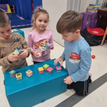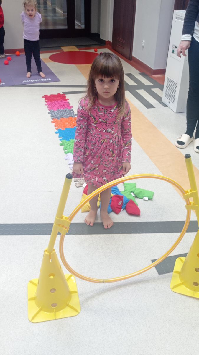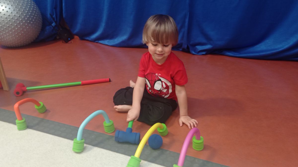 W dniu 24 listopada 2025 roku w Naszym Przedszkolu odbyły się zajęcia sensoryczno-motoryczne „Ruch to zdrowie”. Celem tych zajęć było wielozmysłowe poznawanie świata, czyli odbieranie bodźców różnymi zmysłami. Dodatkowo dzieci usprawniały swoje umiejętności motoryczne, koordynacyjne, równoważne i manualne. Przed wykonaniem ścieżki sensorycznej przedszkolaki wysłuchały krótkiego opowiadania, o tym, jak należy dbać o rozwój fizyczny. Na zajęciach dzieci pokonywały złożony tor przeszkód, podczas którego stymulowały swoje dłonie z użyciem piłeczek sensorycznych o różnym kształcie, wielkości i fakturze; przechodziły po ścieżce fakturowej zakończonej rzutem do celu z wykorzystaniem woreczków gimnastycznych; przechodziły przez obręcz oraz przez beczkę sensoryczną; wsparte na dłoniach i stopach przechodziły po kolorowych kółkach; wchodziły po pochylni wykorzystując linę; za pomocą kija do krykieta i piłeczek trafiały do bramki; segregowały kolorowe piłeczki do pojemników, w tych samych kolorach z wykorzystaniem szczypiec; przekładały obręcz przez całą długość ciała stojąc na berecie sensorycznym i zakładały ją na trzpień; czołgały się pod przeszkodami; przechodziły na czworakach po kołysce równoważnej; rozpoznawały zapachy owoców: gruszka, ananas, wiśnia, pomarańcza, truskawka, kokos i wskazywały rozpoznany owoc na obrazku; manipulowały kostkami sensorycznymi i dobierały je w pary stymulując zmysł słuchu; przechodziły po pufie w dowolny sposób; przechodziły po równoważni z ringiem sensorycznym na głowie; przypinały klamerki od bielizny do twardych przedmiotów: słońce, burak, kaktus, kogut, ptak, marchewka, ryba, królik, muchomor, jeż. W tle słychać było dźwięki muzyki poważnej.
