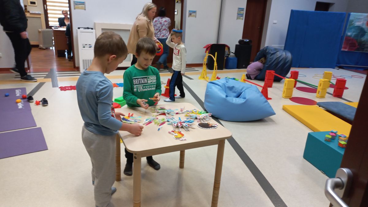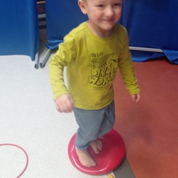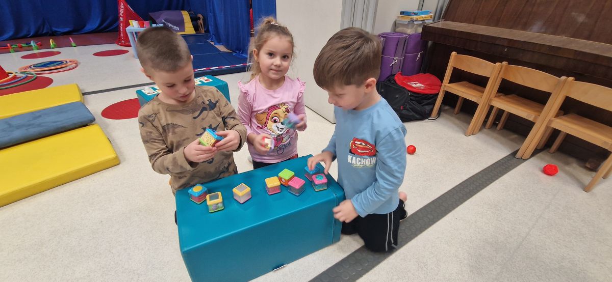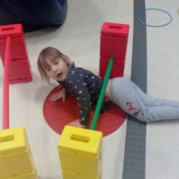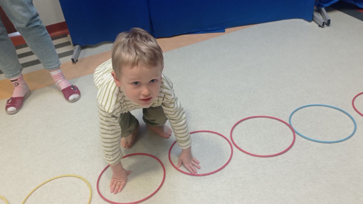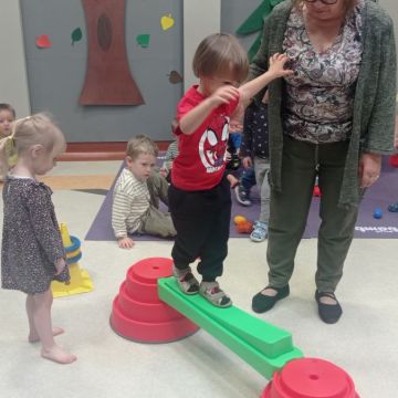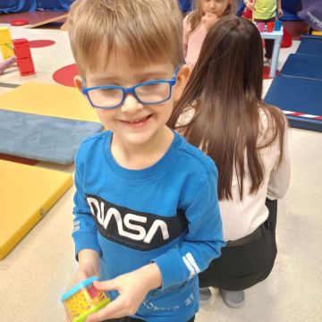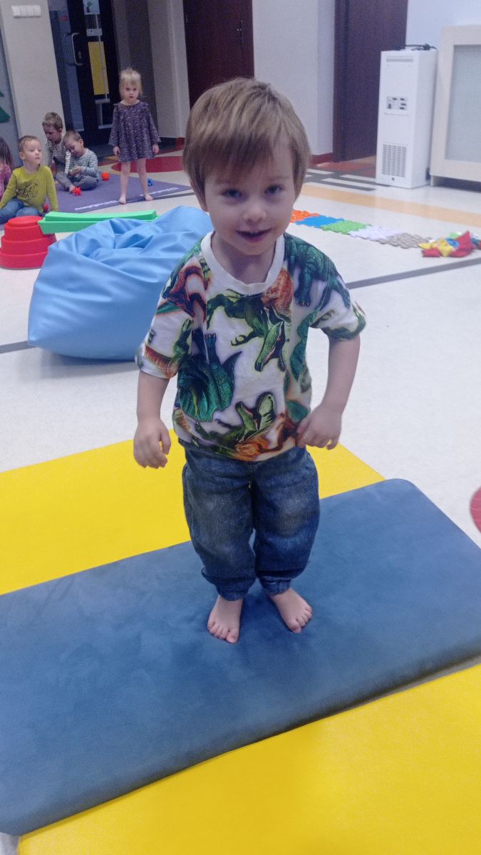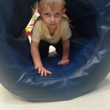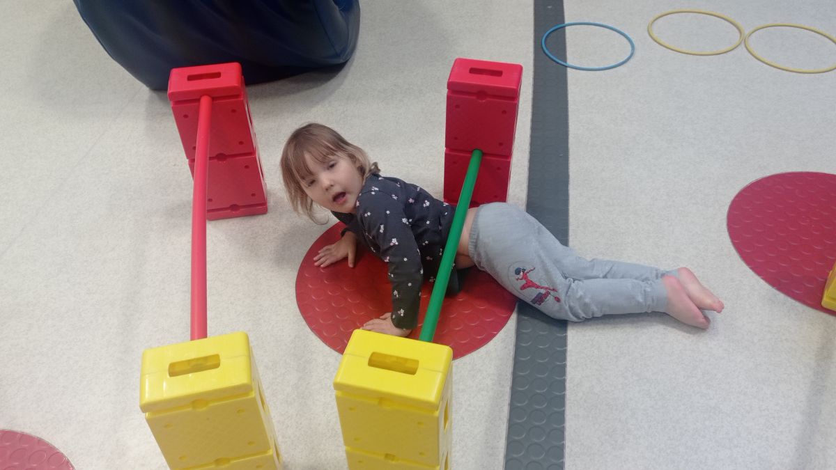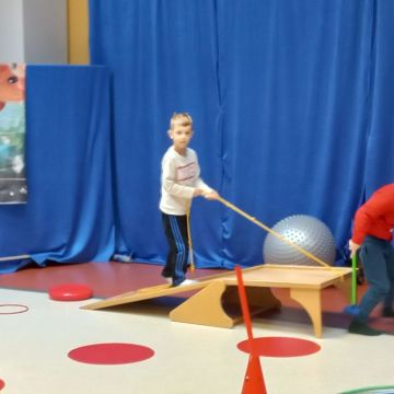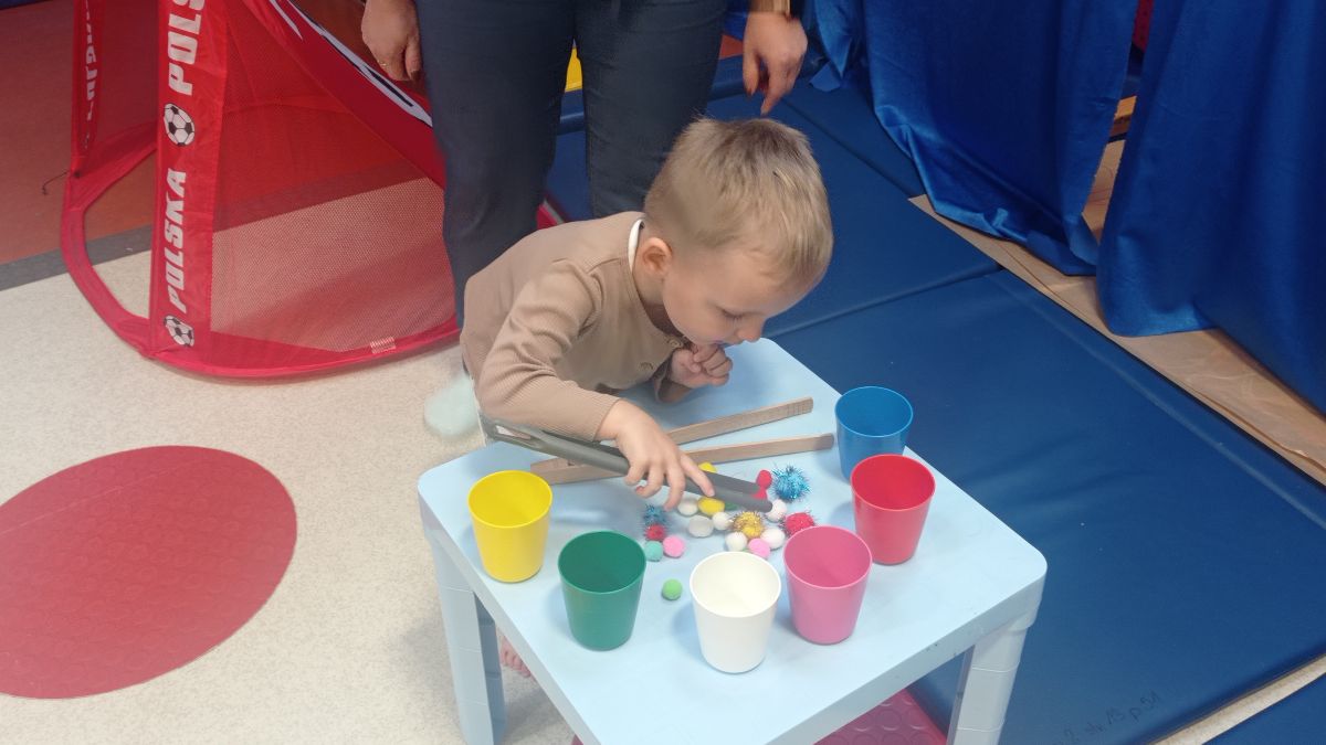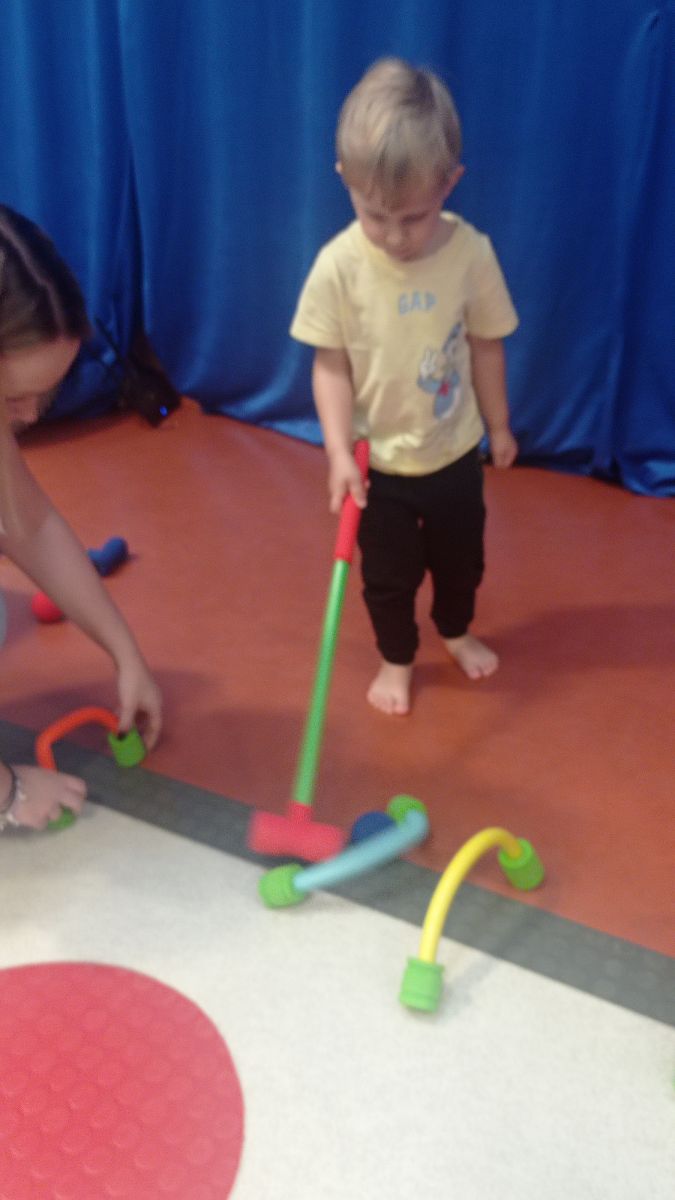 W dniu 24 listopada 2025 roku w Naszym Przedszkolu odbyły się zajęcia sensoryczno-motoryczne „Ruch to zdrowie”. Celem tych zajęć było wielozmysłowe poznawanie świata, czyli odbieranie bodźców różnymi zmysłami. Dodatkowo dzieci usprawniały swoje umiejętności motoryczne, koordynacyjne, równoważne i manualne. Przed wykonaniem ścieżki sensorycznej przedszkolaki wysłuchały krótkiego opowiadania, o tym, jak należy dbać o rozwój fizyczny. Na zajęciach dzieci pokonywały złożony tor przeszkód, podczas którego stymulowały swoje dłonie z użyciem piłeczek sensorycznych o różnym kształcie, wielkości i fakturze; przechodziły po ścieżce fakturowej zakończonej rzutem do celu z wykorzystaniem woreczków gimnastycznych; przechodziły przez obręcz oraz przez beczkę sensoryczną; wsparte na dłoniach i stopach przechodziły po kolorowych kółkach; wchodziły po pochylni wykorzystując linę; za pomocą kija do krykieta i piłeczek trafiały do bramki; segregowały kolorowe piłeczki do pojemników, w tych samych kolorach z wykorzystaniem szczypiec; przekładały obręcz przez całą długość ciała stojąc na berecie sensorycznym i zakładały ją na trzpień; czołgały się pod przeszkodami; przechodziły na czworakach po kołysce równoważnej; rozpoznawały zapachy owoców: gruszka, ananas, wiśnia, pomarańcza, truskawka, kokos i wskazywały rozpoznany owoc na obrazku; manipulowały kostkami sensorycznymi i dobierały je w pary stymulując zmysł słuchu; przechodziły po pufie w dowolny sposób; przechodziły po równoważni z ringiem sensorycznym na głowie; przypinały klamerki od bielizny do twardych przedmiotów: słońce, burak, kaktus, kogut, ptak, marchewka, ryba, królik, muchomor, jeż. W tle słychać było dźwięki muzyki poważnej.