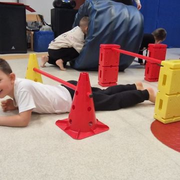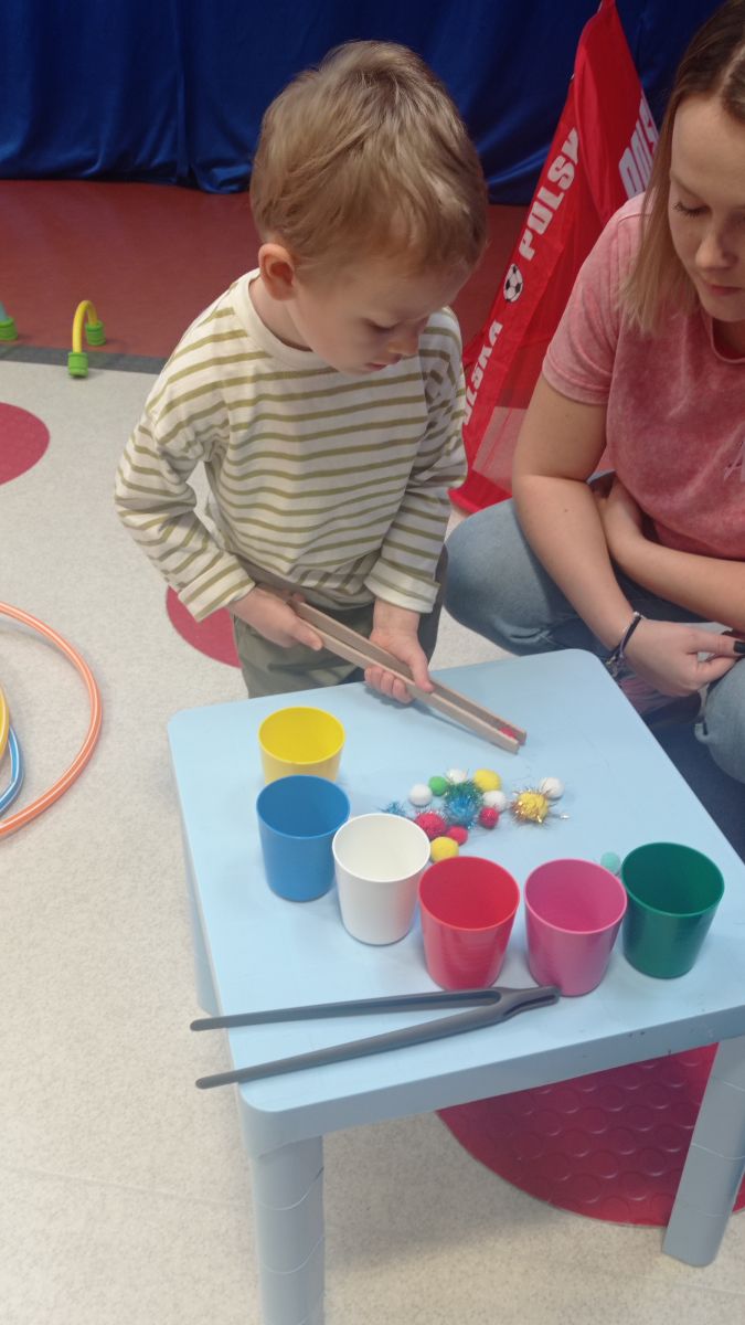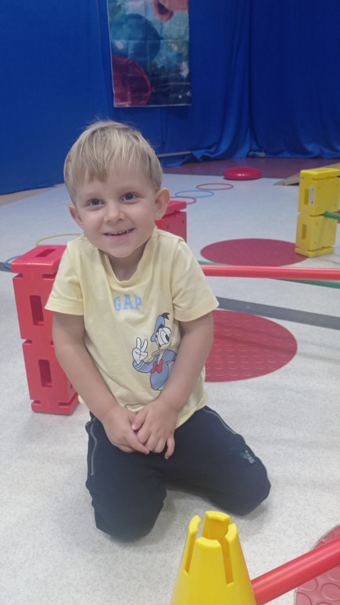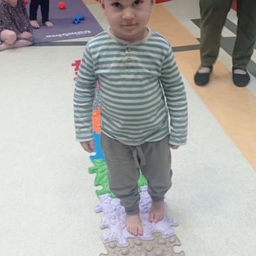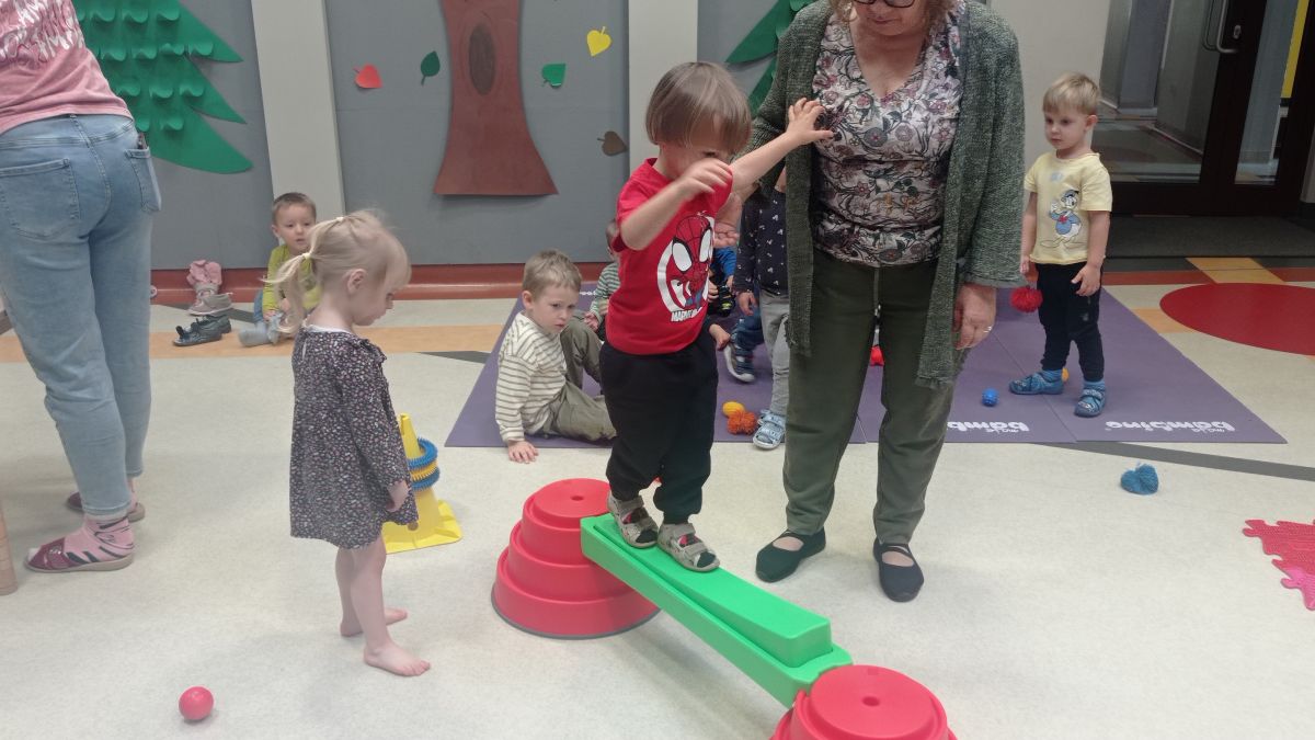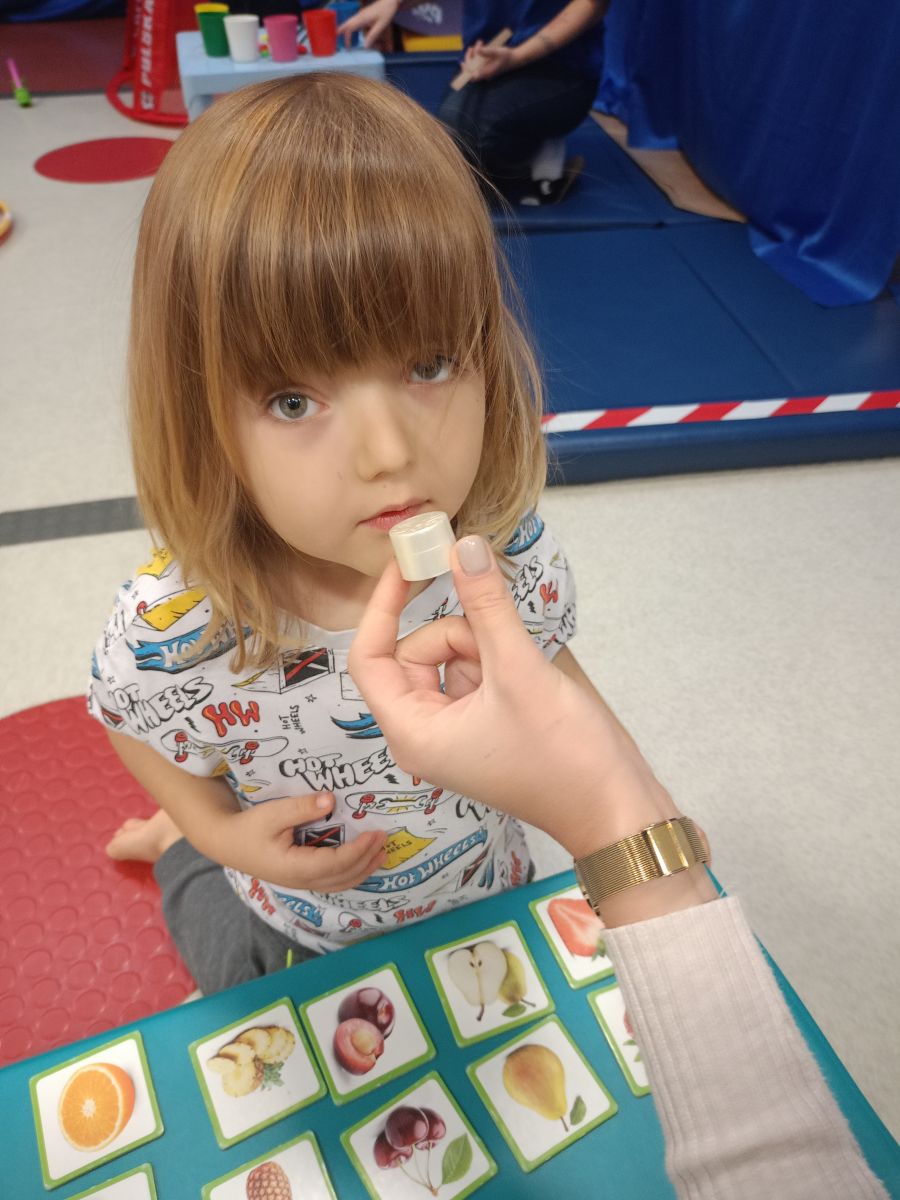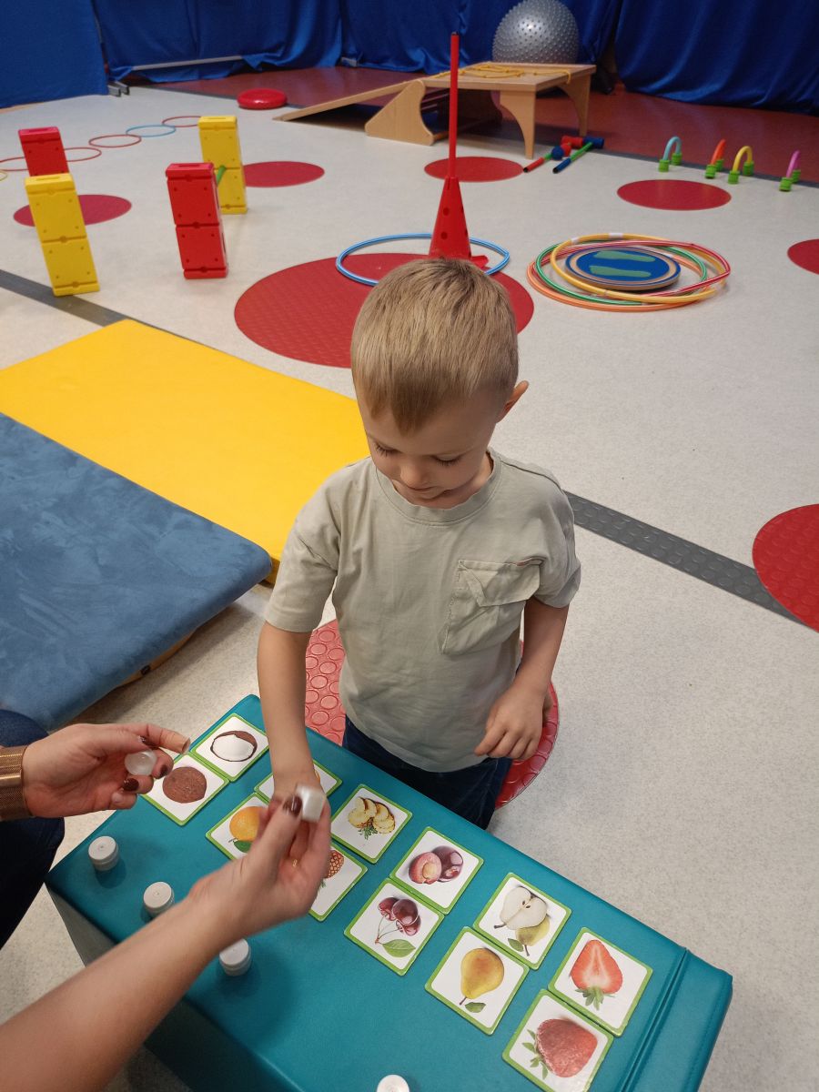 W dniu 24 listopada 2025 roku w Naszym Przedszkolu odbyły się zajęcia sensoryczno-motoryczne „Ruch to zdrowie”. Celem tych zajęć było wielozmysłowe poznawanie świata, czyli odbieranie bodźców różnymi zmysłami. Dodatkowo dzieci usprawniały swoje umiejętności motoryczne, koordynacyjne, równoważne i manualne. Przed wykonaniem ścieżki sensorycznej przedszkolaki wysłuchały krótkiego opowiadania, o tym, jak należy dbać o rozwój fizyczny. Na zajęciach dzieci pokonywały złożony tor przeszkód, podczas którego stymulowały swoje dłonie z użyciem piłeczek sensorycznych o różnym kształcie, wielkości i fakturze; przechodziły po ścieżce fakturowej zakończonej rzutem do celu z wykorzystaniem woreczków gimnastycznych; przechodziły przez obręcz oraz przez beczkę sensoryczną; wsparte na dłoniach i stopach przechodziły po kolorowych kółkach; wchodziły po pochylni wykorzystując linę; za pomocą kija do krykieta i piłeczek trafiały do bramki; segregowały kolorowe piłeczki do pojemników, w tych samych kolorach z wykorzystaniem szczypiec; przekładały obręcz przez całą długość ciała stojąc na berecie sensorycznym i zakładały ją na trzpień; czołgały się pod przeszkodami; przechodziły na czworakach po kołysce równoważnej; rozpoznawały zapachy owoców: gruszka, ananas, wiśnia, pomarańcza, truskawka, kokos i wskazywały rozpoznany owoc na obrazku; manipulowały kostkami sensorycznymi i dobierały je w pary stymulując zmysł słuchu; przechodziły po pufie w dowolny sposób; przechodziły po równoważni z ringiem sensorycznym na głowie; przypinały klamerki od bielizny do twardych przedmiotów: słońce, burak, kaktus, kogut, ptak, marchewka, ryba, królik, muchomor, jeż. W tle słychać było dźwięki muzyki poważnej.