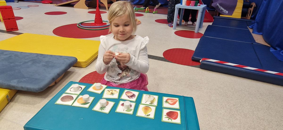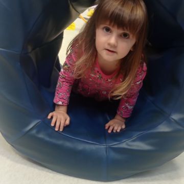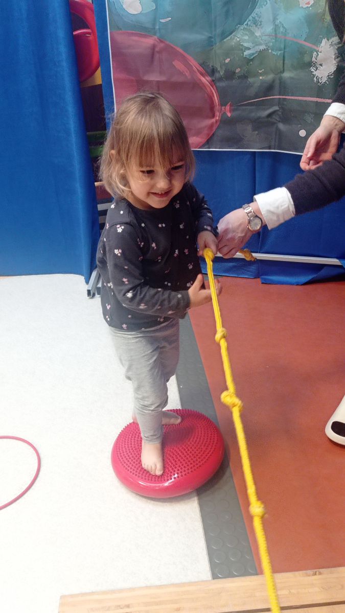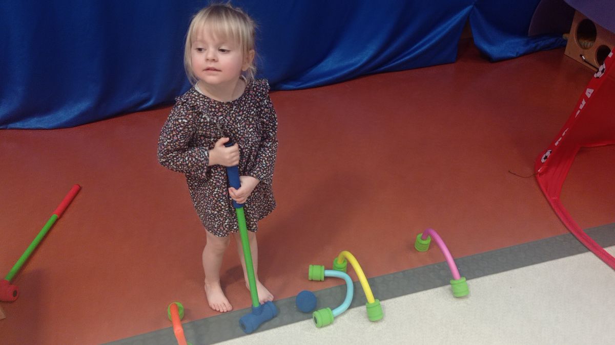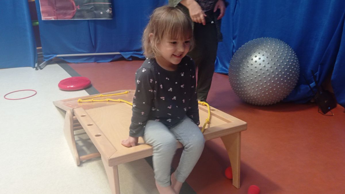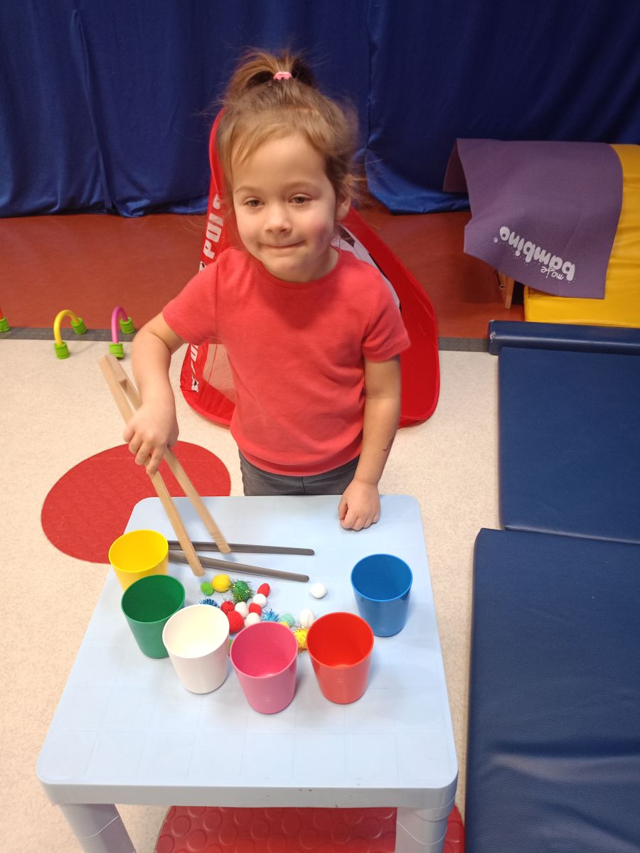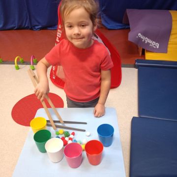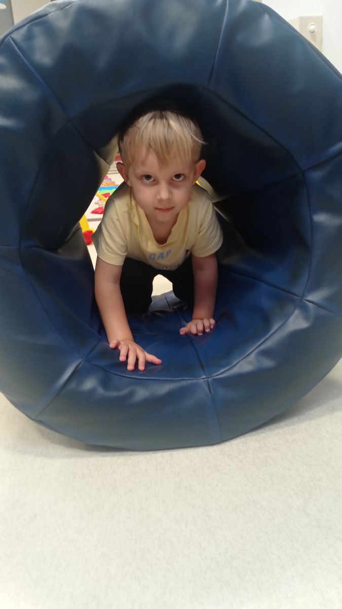 W dniu 24 listopada 2025 roku w Naszym Przedszkolu odbyły się zajęcia sensoryczno-motoryczne „Ruch to zdrowie”. Celem tych zajęć było wielozmysłowe poznawanie świata, czyli odbieranie bodźców różnymi zmysłami. Dodatkowo dzieci usprawniały swoje umiejętności motoryczne, koordynacyjne, równoważne i manualne. Przed wykonaniem ścieżki sensorycznej przedszkolaki wysłuchały krótkiego opowiadania, o tym, jak należy dbać o rozwój fizyczny. Na zajęciach dzieci pokonywały złożony tor przeszkód, podczas którego stymulowały swoje dłonie z użyciem piłeczek sensorycznych o różnym kształcie, wielkości i fakturze; przechodziły po ścieżce fakturowej zakończonej rzutem do celu z wykorzystaniem woreczków gimnastycznych; przechodziły przez obręcz oraz przez beczkę sensoryczną; wsparte na dłoniach i stopach przechodziły po kolorowych kółkach; wchodziły po pochylni wykorzystując linę; za pomocą kija do krykieta i piłeczek trafiały do bramki; segregowały kolorowe piłeczki do pojemników, w tych samych kolorach z wykorzystaniem szczypiec; przekładały obręcz przez całą długość ciała stojąc na berecie sensorycznym i zakładały ją na trzpień; czołgały się pod przeszkodami; przechodziły na czworakach po kołysce równoważnej; rozpoznawały zapachy owoców: gruszka, ananas, wiśnia, pomarańcza, truskawka, kokos i wskazywały rozpoznany owoc na obrazku; manipulowały kostkami sensorycznymi i dobierały je w pary stymulując zmysł słuchu; przechodziły po pufie w dowolny sposób; przechodziły po równoważni z ringiem sensorycznym na głowie; przypinały klamerki od bielizny do twardych przedmiotów: słońce, burak, kaktus, kogut, ptak, marchewka, ryba, królik, muchomor, jeż. W tle słychać było dźwięki muzyki poważnej.