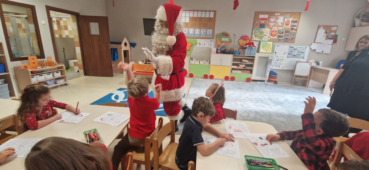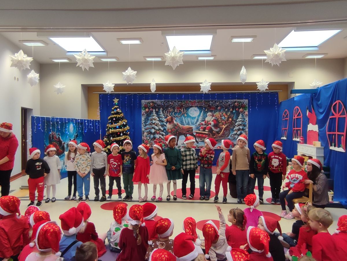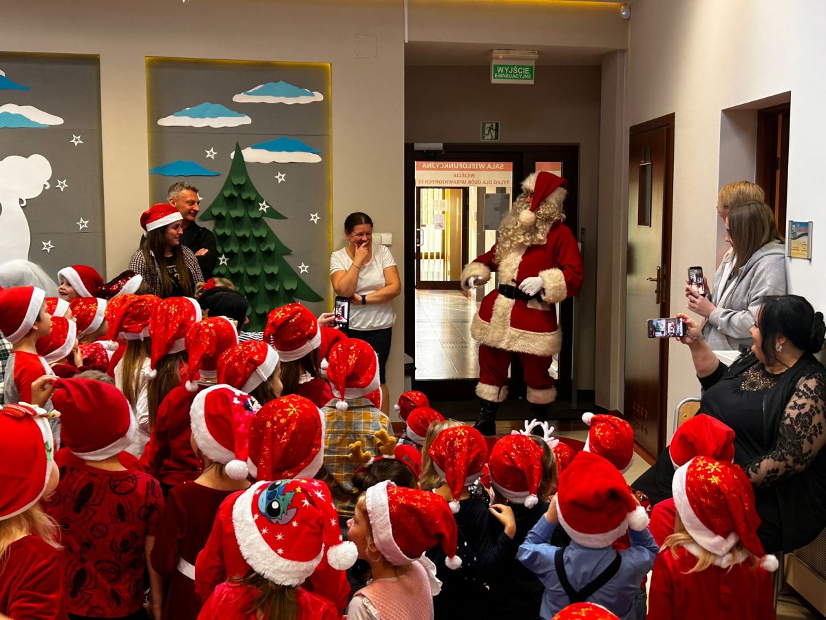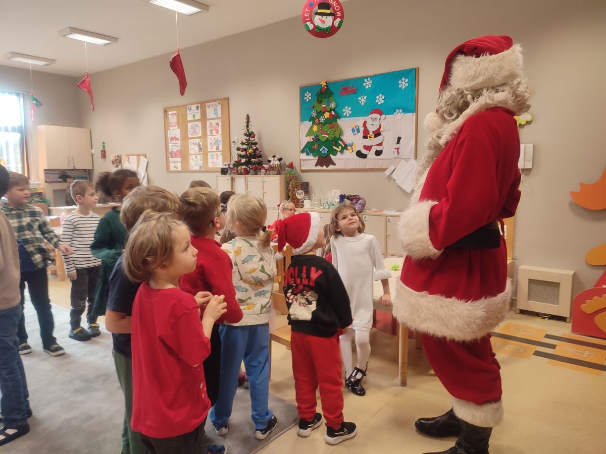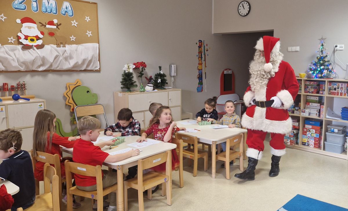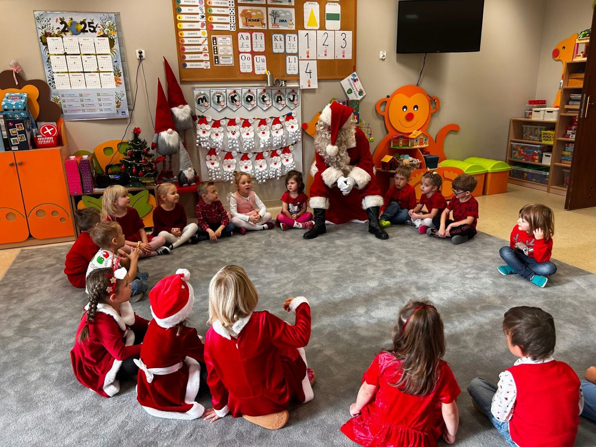 W dniu 5 grudnia 2025 r. odwiedził nas w przedszkolu wyjątkowy Gość, na którego czekaliśmy calusieńki rok. Zanim zadzwoniły dzwoneczki zwiastujące jego przybycie, Dzieci obejrzały spektakl pt. „Urlop Świętego Mikołaja” zaprezentowany przez Agencję „MAT-ART”. To pełne efektownych sztuczek i zabawnych scen przedstawienie opowiedziało o planowanym wypoczynku Świętego Mikołaja w ciepłych krajach. Nie mając jednak pewności, czy wszystkie prezenty dotrą do odbiorców na czas, Mikołaj postanowił zrezygnować z wyjazdu. Na spotkanie z naszym szanownym Gościem przygotowana była piękna dekoracja oraz wygodny tron, na którym mógł odpocząć po długiej podróży. Jak co roku, każda grupa odśpiewała dla Mikołaja tematyczną piosenkę, po czym odbyło się wręczanie Dzieciom paczek połączone z sesją fotograficzną. Święty Mikołaj przyznał, że wyjątkowo mu się u nas podobało i obiecał, że odwiedzi nas za rok. Razem z workiem pełnym podarków nasz Gość przywiózł nam dużo uśmiechu i magii Świąt Bożego Narodzenia.