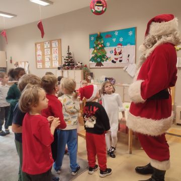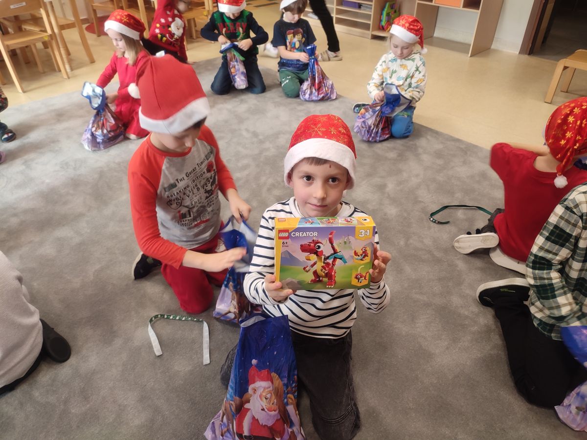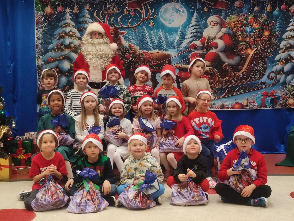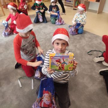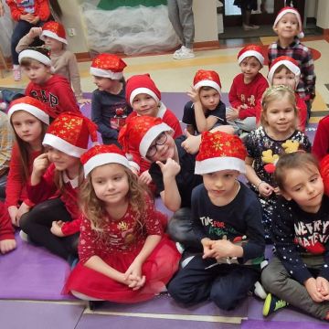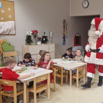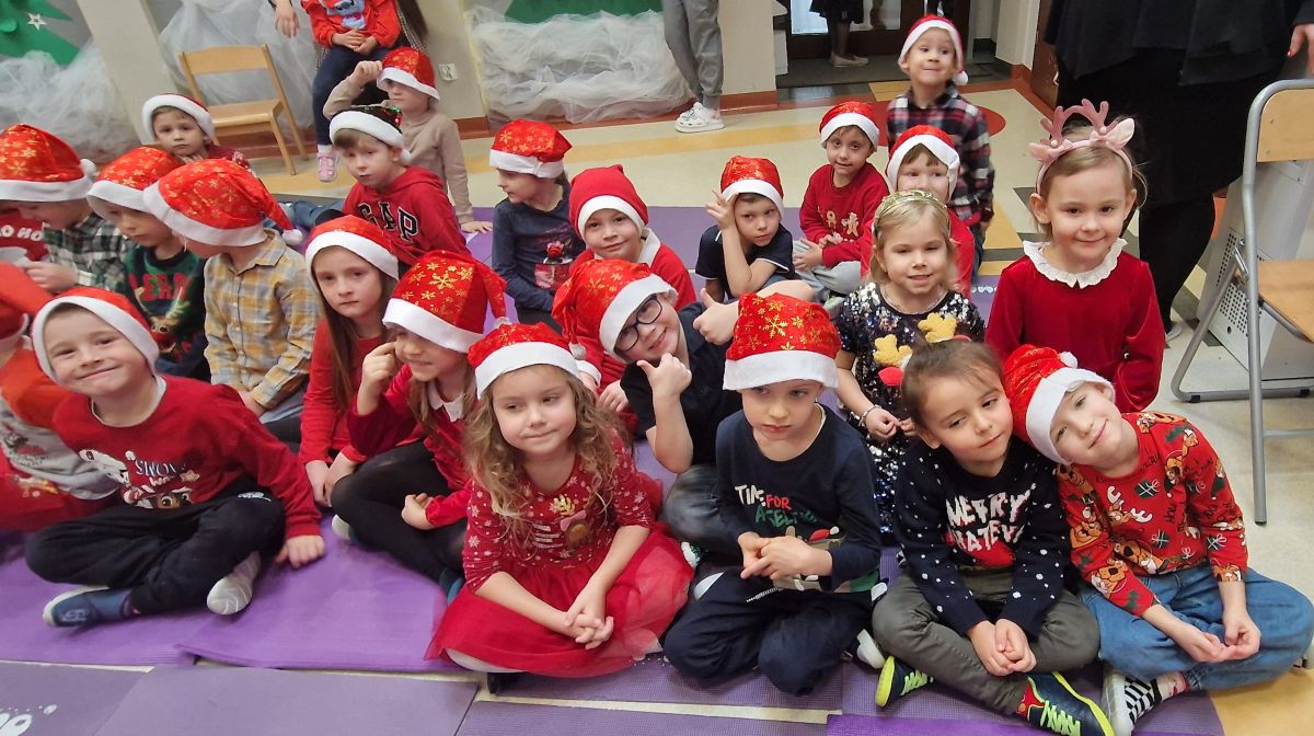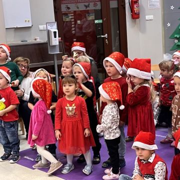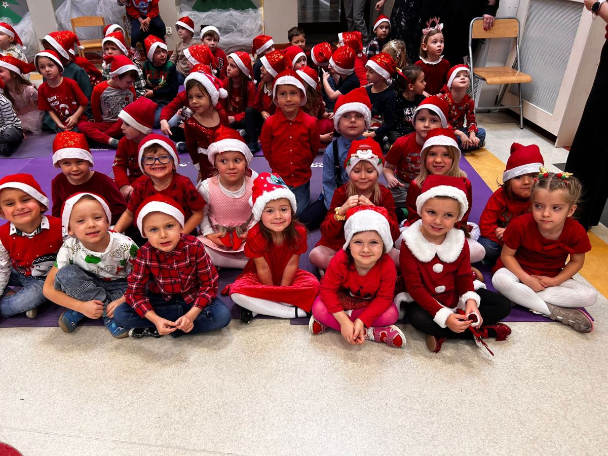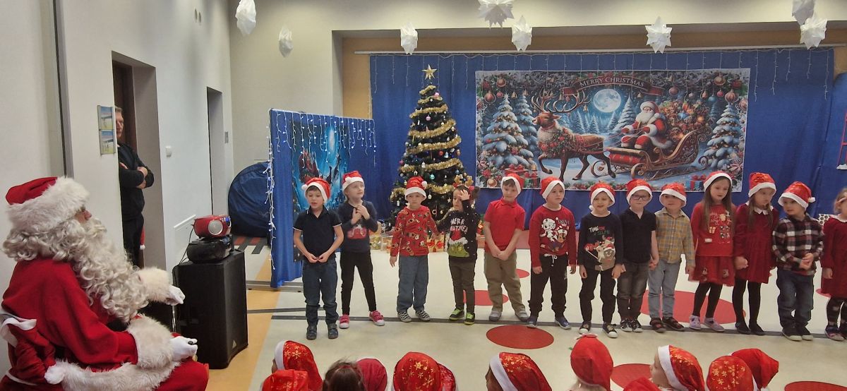 W dniu 5 grudnia 2025 r. odwiedził nas w przedszkolu wyjątkowy Gość, na którego czekaliśmy calusieńki rok. Zanim zadzwoniły dzwoneczki zwiastujące jego przybycie, Dzieci obejrzały spektakl pt. „Urlop Świętego Mikołaja” zaprezentowany przez Agencję „MAT-ART”. To pełne efektownych sztuczek i zabawnych scen przedstawienie opowiedziało o planowanym wypoczynku Świętego Mikołaja w ciepłych krajach. Nie mając jednak pewności, czy wszystkie prezenty dotrą do odbiorców na czas, Mikołaj postanowił zrezygnować z wyjazdu. Na spotkanie z naszym szanownym Gościem przygotowana była piękna dekoracja oraz wygodny tron, na którym mógł odpocząć po długiej podróży. Jak co roku, każda grupa odśpiewała dla Mikołaja tematyczną piosenkę, po czym odbyło się wręczanie Dzieciom paczek połączone z sesją fotograficzną. Święty Mikołaj przyznał, że wyjątkowo mu się u nas podobało i obiecał, że odwiedzi nas za rok. Razem z workiem pełnym podarków nasz Gość przywiózł nam dużo uśmiechu i magii Świąt Bożego Narodzenia.