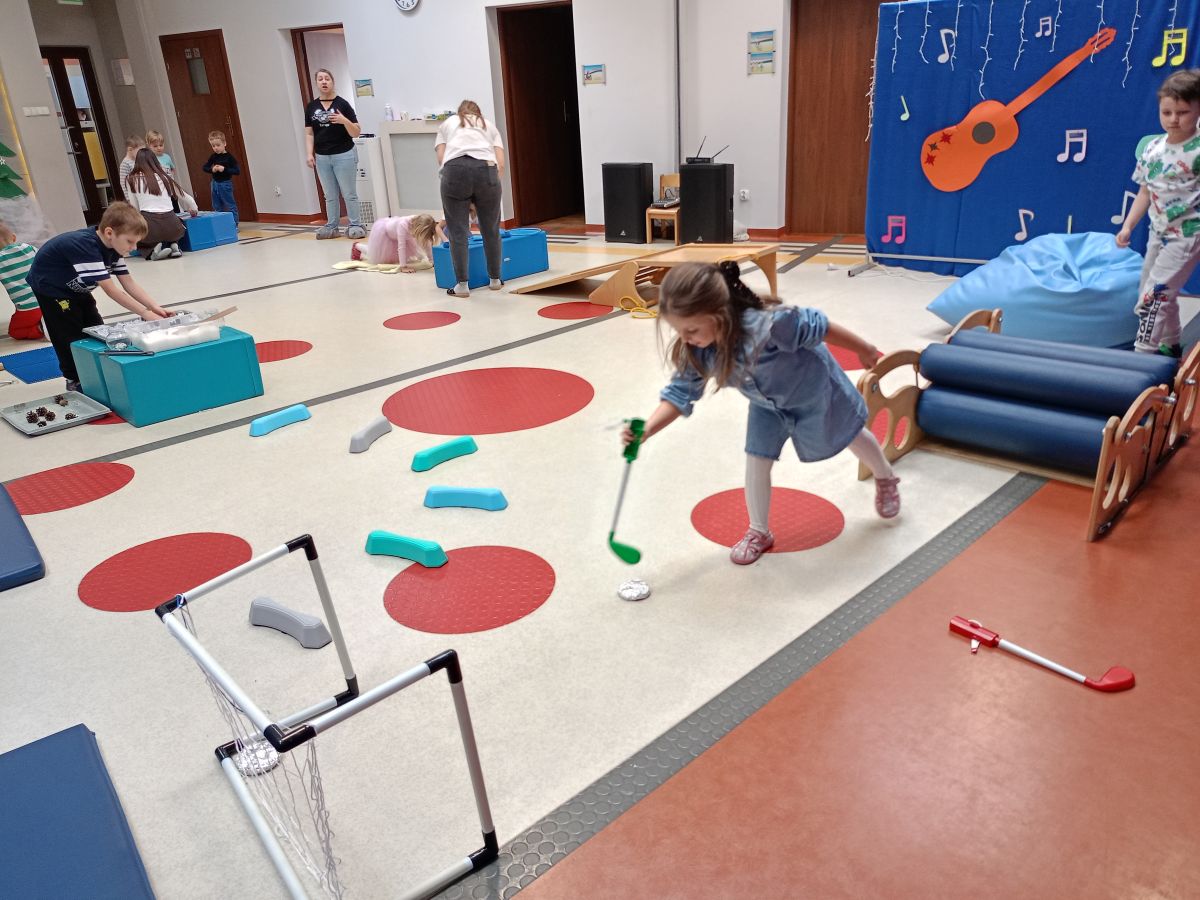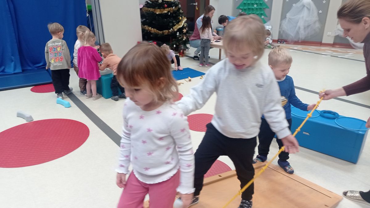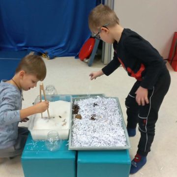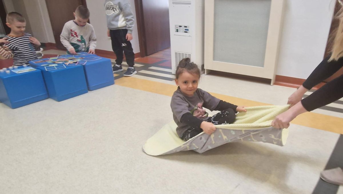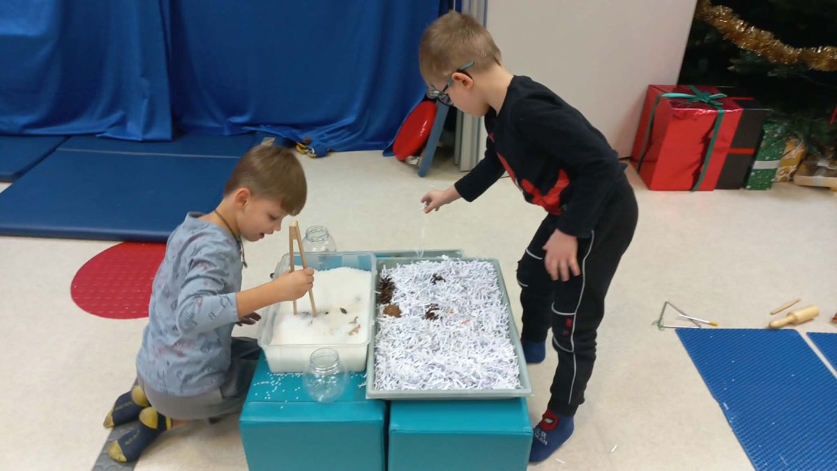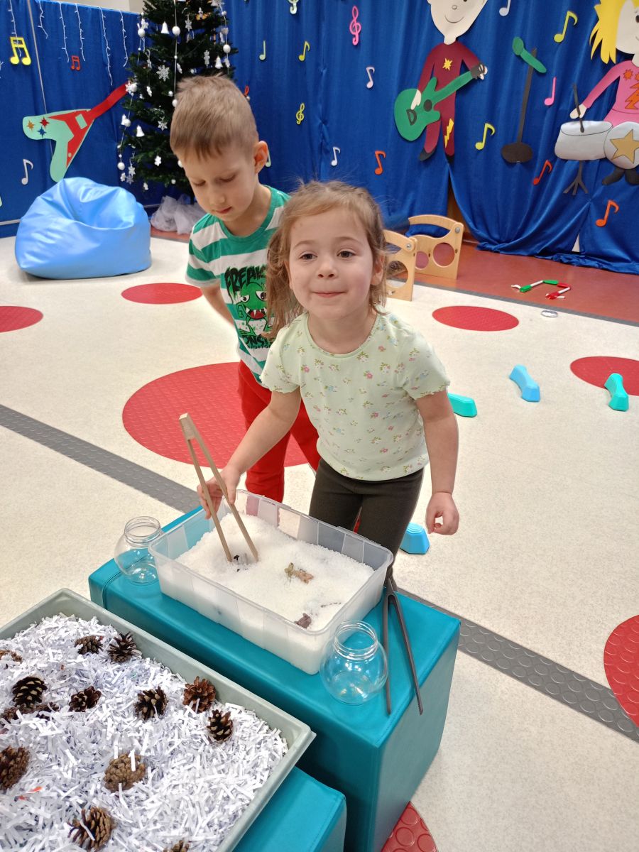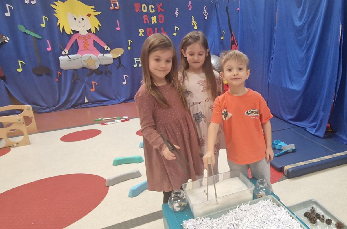 W dniu 21 stycznia 2026 roku w Naszym Przedszkolu odbyły się zajęcia sensoryczno – motoryczne pod nazwą „Las zimą”. Celem tych zajęć była stymulacja polisensoryczna, czyli dostarczanie różnorodnych bodźców sensorycznych: wzrokowych, słuchowych, dotykowych, proprioceptywnych, węchowych oraz planowania motorycznego, aby pobudzić zmysły, rozwinąć percepcje oraz umiejętności poznawcze. Zajęcia były dostosowane do potrzeb i możliwości dziecka w wieku przedszkolnym. Proponowane aktywności sprawiały, że dzieci poznawały i doświadczały poprzez zmysły: wzroku (rzucanie do celu kulkami zrobionymi z gazety, układanie puzzli zgodnych z rozpoznanym zapachem, uzupełnianie kółek woreczkami w tym samym kolorze, trafianie kijem hokejowym w krążek, omijanie napotkanych przeszkód, wyszukiwanie zwierzątek w sztucznym śniegu z wykorzystaniem szczypiec, wybieranie szyszek z masy papierowej, wydrapywanie śnieżynki z użyciem drewnianego patyczka); słuchu: (słuchanie opowiadania o tematyce „przygoda w lesie”, wystukiwanie odgłosów zwierząt na instrumentach muzycznych: janczary, dzwonki, drewienka, jajeczko, trójkąt, grzechotka, tamburyno); dotyku: (przesuwanie się na kocu z punktu A do punktu B, siad w siadzie skrzyżnym na berecie sensorycznym, rozpoznawanie ciężaru woreczków, wchodzenie na pochylnię z użyciem liny przy ruchach naprzemiennych rąk, przejście przez dużą i miękką pufę, praca z użyciem szczypiec, różnicowanie dotykiem: szyszki, papier, figurki zwierząt, sztuczny śnieg, wydrapywanki, budowanie igloo z użyciem pudełek w folii aluminiowej oraz dużej foli bąbelkowej); węchu: (rozpoznawanie zapachów: róża, jabłko, mięta, trawa, dym, mydło); planowania motorycznego: (pokonywanie złożonego toru przeszkód, budowanie igloo z użyciem pudełek w folii aluminiowej oraz folii bąbelkowej – praca w grupie, przejście po wyznaczonej trasie – tropem zwierząt leśnych i rzucanie do celu); propriocepcji: ( przeciąganie się na kocu na twardym podłożu, przeskakiwanie przez przeszkody, przejście po pufie wypełnionej granulatem, przeciśnięcie się przez maglownicę, ugniatanie kulek z gazety).