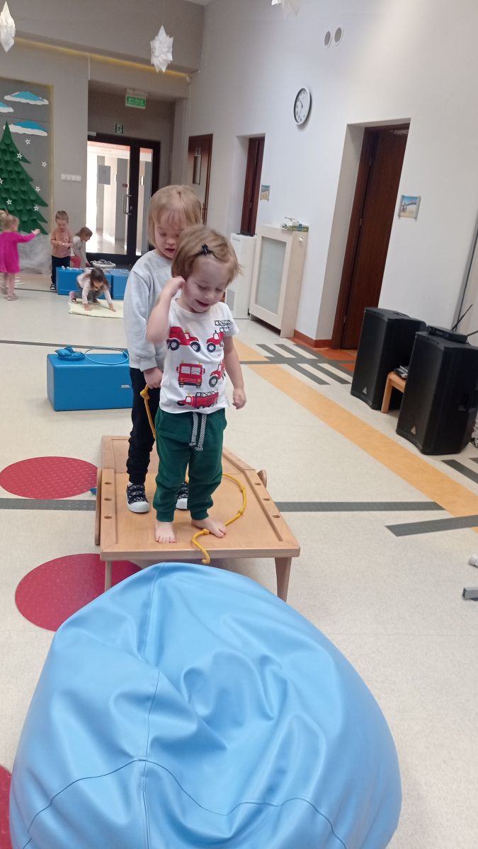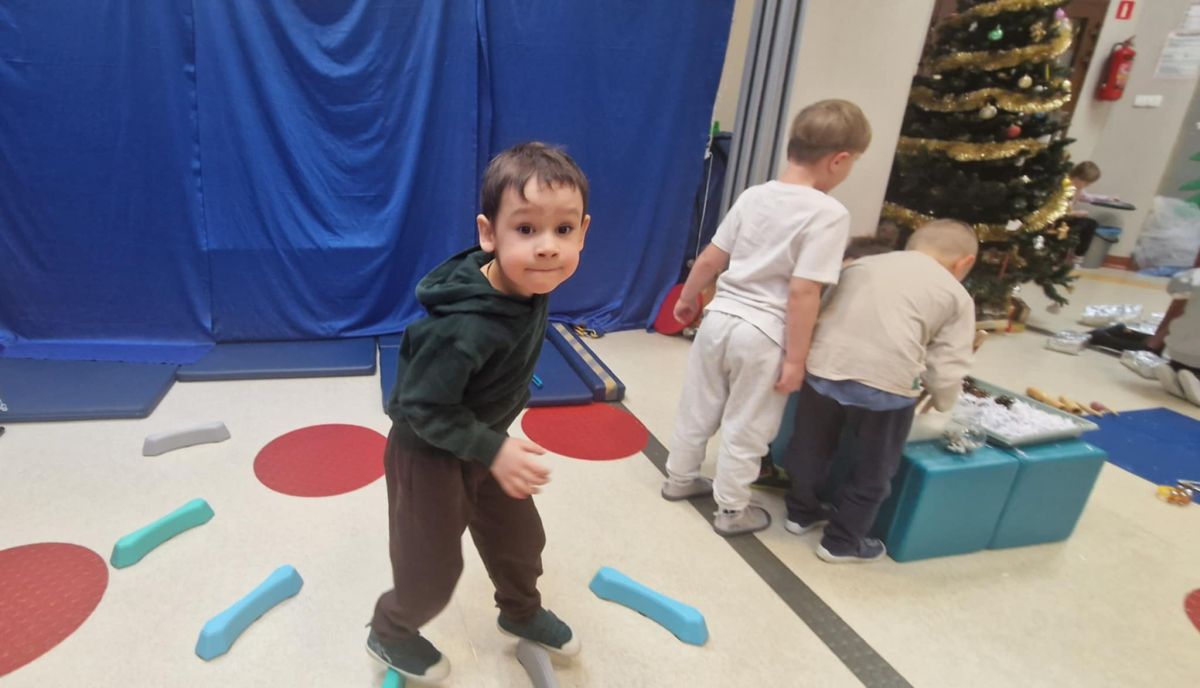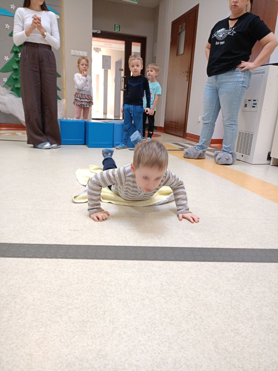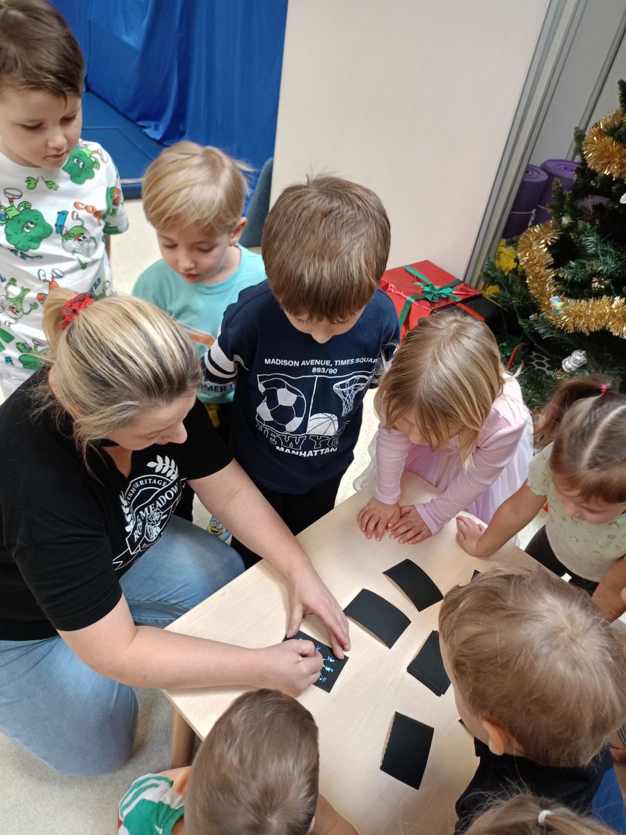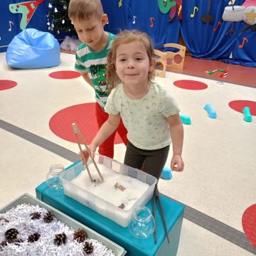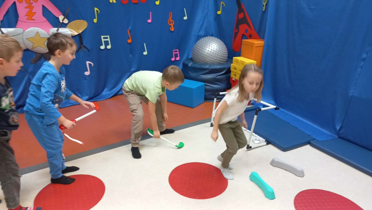 W dniu 21 stycznia 2026 roku w Naszym Przedszkolu odbyły się zajęcia sensoryczno – motoryczne pod nazwą „Las zimą”. Celem tych zajęć była stymulacja polisensoryczna, czyli dostarczanie różnorodnych bodźców sensorycznych: wzrokowych, słuchowych, dotykowych, proprioceptywnych, węchowych oraz planowania motorycznego, aby pobudzić zmysły, rozwinąć percepcje oraz umiejętności poznawcze. Zajęcia były dostosowane do potrzeb i możliwości dziecka w wieku przedszkolnym. Proponowane aktywności sprawiały, że dzieci poznawały i doświadczały poprzez zmysły: wzroku (rzucanie do celu kulkami zrobionymi z gazety, układanie puzzli zgodnych z rozpoznanym zapachem, uzupełnianie kółek woreczkami w tym samym kolorze, trafianie kijem hokejowym w krążek, omijanie napotkanych przeszkód, wyszukiwanie zwierzątek w sztucznym śniegu z wykorzystaniem szczypiec, wybieranie szyszek z masy papierowej, wydrapywanie śnieżynki z użyciem drewnianego patyczka); słuchu: (słuchanie opowiadania o tematyce „przygoda w lesie”, wystukiwanie odgłosów zwierząt na instrumentach muzycznych: janczary, dzwonki, drewienka, jajeczko, trójkąt, grzechotka, tamburyno); dotyku: (przesuwanie się na kocu z punktu A do punktu B, siad w siadzie skrzyżnym na berecie sensorycznym, rozpoznawanie ciężaru woreczków, wchodzenie na pochylnię z użyciem liny przy ruchach naprzemiennych rąk, przejście przez dużą i miękką pufę, praca z użyciem szczypiec, różnicowanie dotykiem: szyszki, papier, figurki zwierząt, sztuczny śnieg, wydrapywanki, budowanie igloo z użyciem pudełek w folii aluminiowej oraz dużej foli bąbelkowej); węchu: (rozpoznawanie zapachów: róża, jabłko, mięta, trawa, dym, mydło); planowania motorycznego: (pokonywanie złożonego toru przeszkód, budowanie igloo z użyciem pudełek w folii aluminiowej oraz folii bąbelkowej – praca w grupie, przejście po wyznaczonej trasie – tropem zwierząt leśnych i rzucanie do celu); propriocepcji: ( przeciąganie się na kocu na twardym podłożu, przeskakiwanie przez przeszkody, przejście po pufie wypełnionej granulatem, przeciśnięcie się przez maglownicę, ugniatanie kulek z gazety).