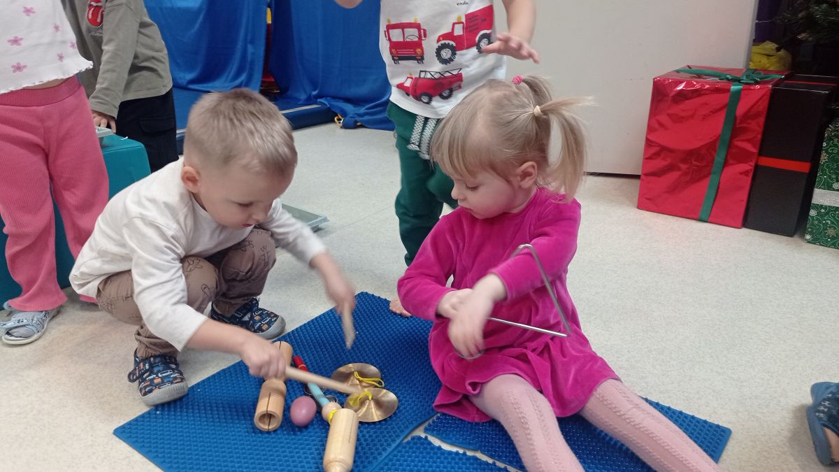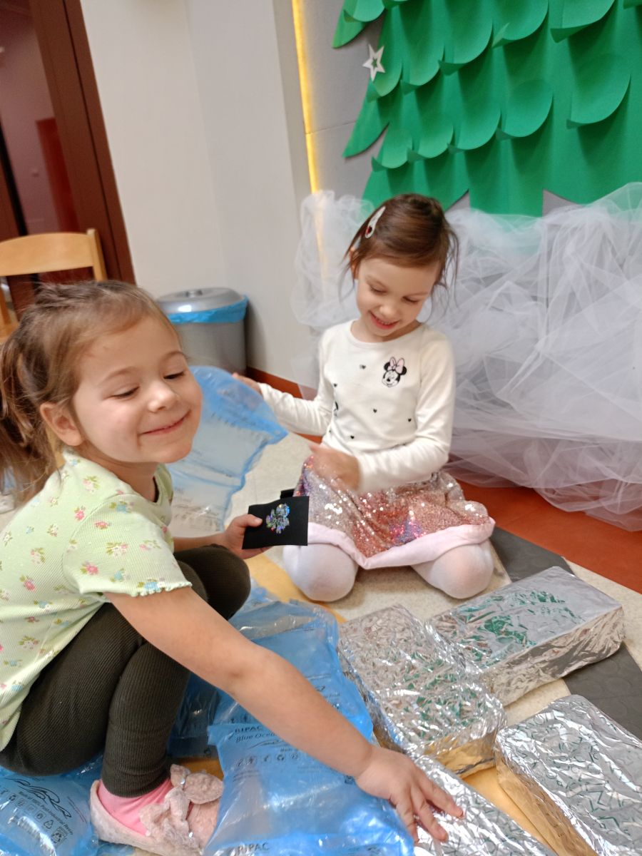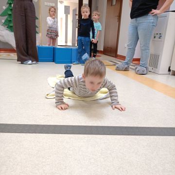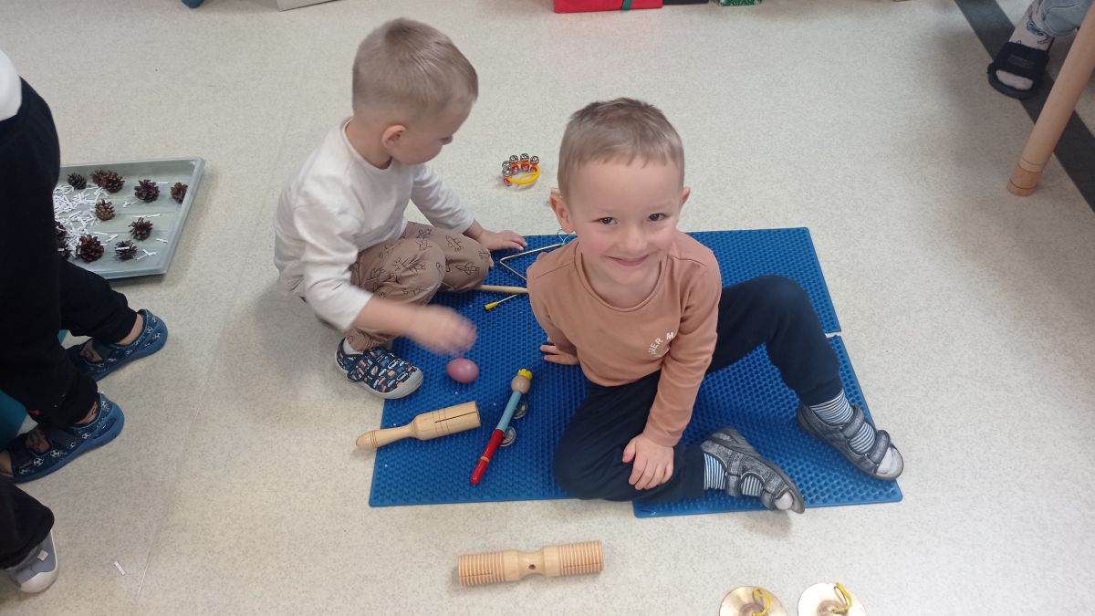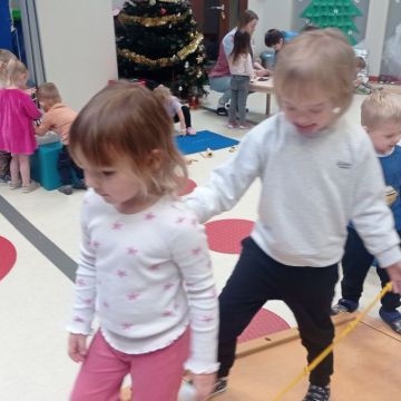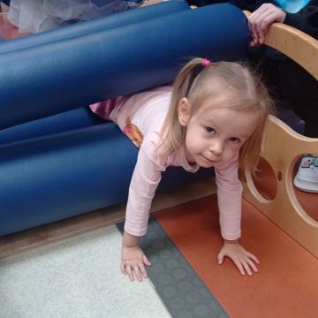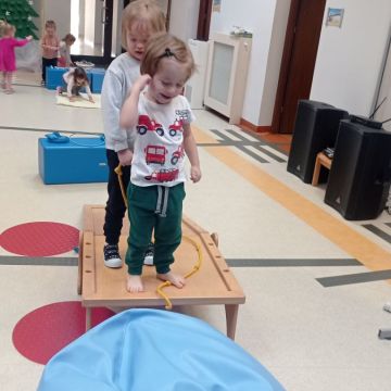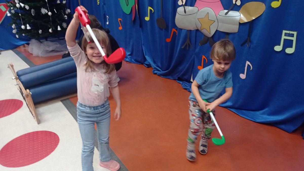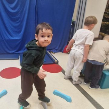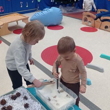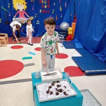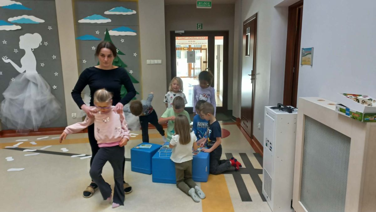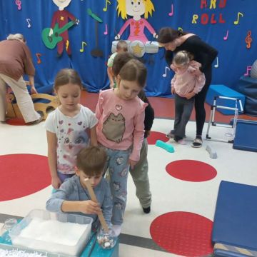 W dniu 21 stycznia 2026 roku w Naszym Przedszkolu odbyły się zajęcia sensoryczno – motoryczne pod nazwą „Las zimą”. Celem tych zajęć była stymulacja polisensoryczna, czyli dostarczanie różnorodnych bodźców sensorycznych: wzrokowych, słuchowych, dotykowych, proprioceptywnych, węchowych oraz planowania motorycznego, aby pobudzić zmysły, rozwinąć percepcje oraz umiejętności poznawcze. Zajęcia były dostosowane do potrzeb i możliwości dziecka w wieku przedszkolnym. Proponowane aktywności sprawiały, że dzieci poznawały i doświadczały poprzez zmysły: wzroku (rzucanie do celu kulkami zrobionymi z gazety, układanie puzzli zgodnych z rozpoznanym zapachem, uzupełnianie kółek woreczkami w tym samym kolorze, trafianie kijem hokejowym w krążek, omijanie napotkanych przeszkód, wyszukiwanie zwierzątek w sztucznym śniegu z wykorzystaniem szczypiec, wybieranie szyszek z masy papierowej, wydrapywanie śnieżynki z użyciem drewnianego patyczka); słuchu: (słuchanie opowiadania o tematyce „przygoda w lesie”, wystukiwanie odgłosów zwierząt na instrumentach muzycznych: janczary, dzwonki, drewienka, jajeczko, trójkąt, grzechotka, tamburyno); dotyku: (przesuwanie się na kocu z punktu A do punktu B, siad w siadzie skrzyżnym na berecie sensorycznym, rozpoznawanie ciężaru woreczków, wchodzenie na pochylnię z użyciem liny przy ruchach naprzemiennych rąk, przejście przez dużą i miękką pufę, praca z użyciem szczypiec, różnicowanie dotykiem: szyszki, papier, figurki zwierząt, sztuczny śnieg, wydrapywanki, budowanie igloo z użyciem pudełek w folii aluminiowej oraz dużej foli bąbelkowej); węchu: (rozpoznawanie zapachów: róża, jabłko, mięta, trawa, dym, mydło); planowania motorycznego: (pokonywanie złożonego toru przeszkód, budowanie igloo z użyciem pudełek w folii aluminiowej oraz folii bąbelkowej – praca w grupie, przejście po wyznaczonej trasie – tropem zwierząt leśnych i rzucanie do celu); propriocepcji: ( przeciąganie się na kocu na twardym podłożu, przeskakiwanie przez przeszkody, przejście po pufie wypełnionej granulatem, przeciśnięcie się przez maglownicę, ugniatanie kulek z gazety).