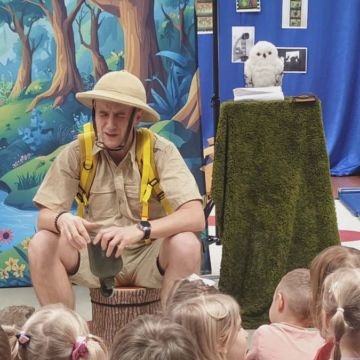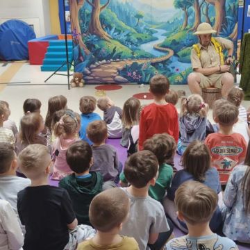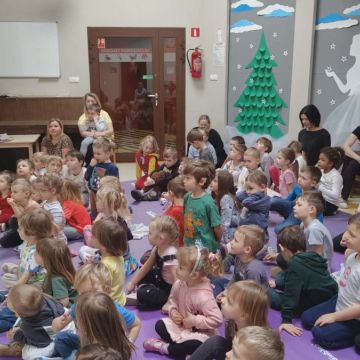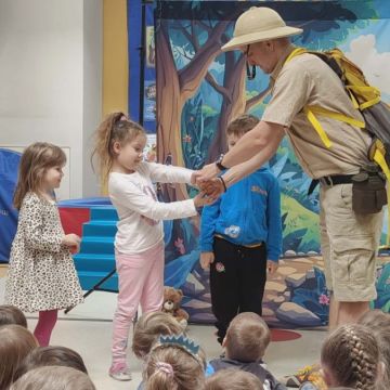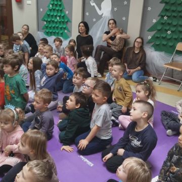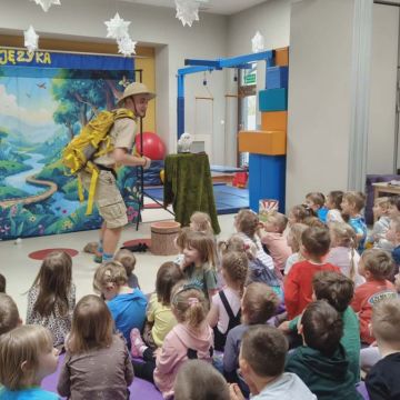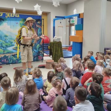 W dniu 05.03.2026r. gościliśmy zaprzyjaźnioną agencję artystyczną Mat - Art z przedstawieniem pt. „Wypraw po dobro”. Przedstawienie opowiadało o podróży pewnego wędrowca – Dobromira, który wyrusza na misję ratunkową, kierując się radami swojej mądrej przyjaciółki – gadającej sowy. Wspólnie poszukiwali najważniejszych wartości, którymi warto kierować się w życiu: uczciwości, odwagi, przyjaźni i empatii. Dzieci były świadkami kilku zaskakujących „magicznych” sztuczek, które w obrazowy sposób ilustrowały morały płynące z opowieści. Jedną z nich była historia małego dzbanka i czerwonych kulek symbolizujących prawdę – mimo prób ich ukrycia, prawda zawsze wracała na wierzch. Inna scena przedstawiała żarówkę, która zaczynała świecić tylko wtedy, gdy ktoś okazywał innej osobie empatię – piękna metafora pokazująca, jak ważne jest zrozumienie i wrażliwość na drugiego człowieka. Spektakl wprowadził dzieci w świat wartości społecznych i emocjonalnych oraz opierał się na interakcji z dziećmi, zabawie, rymowankach, pracy z emocjami i symbolami.