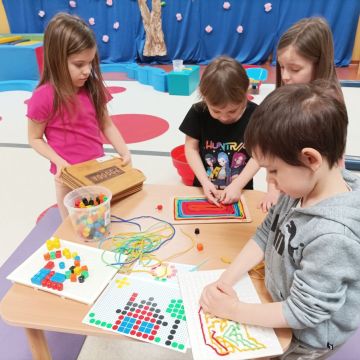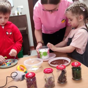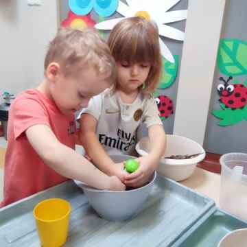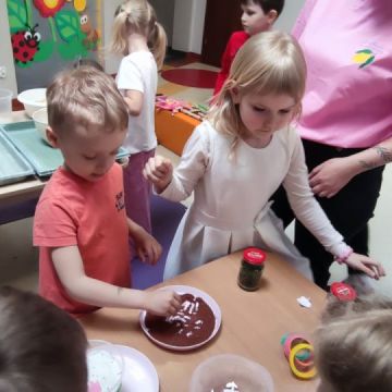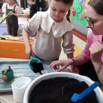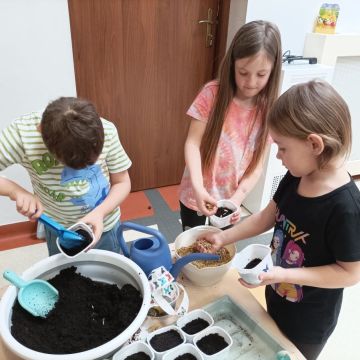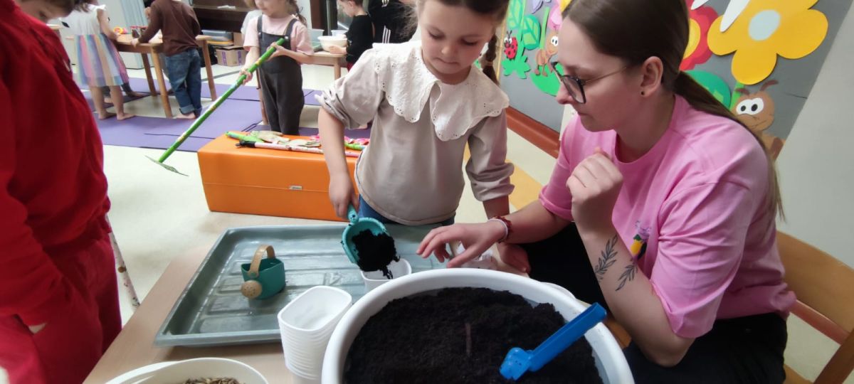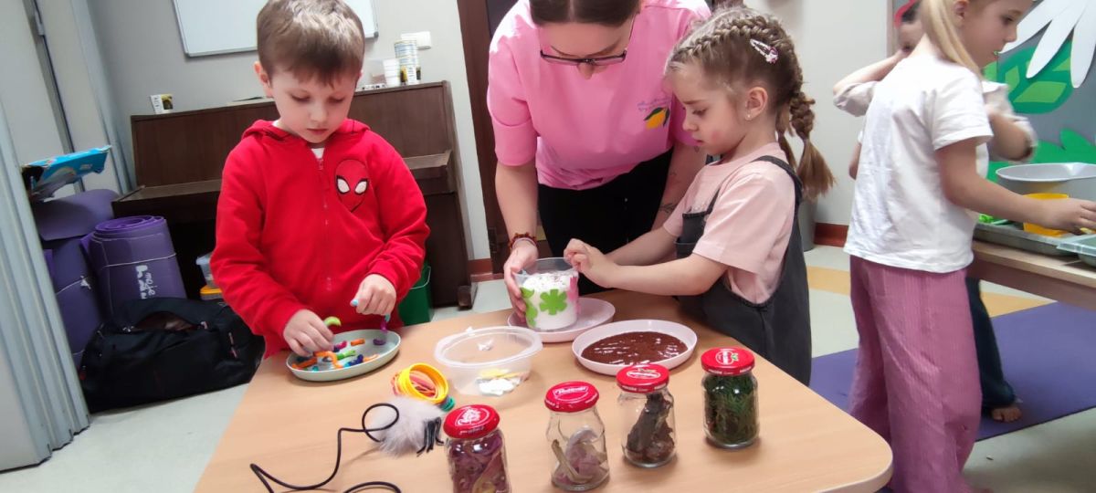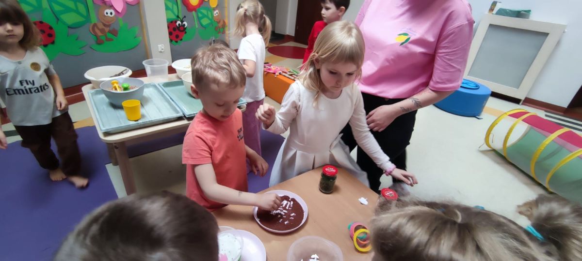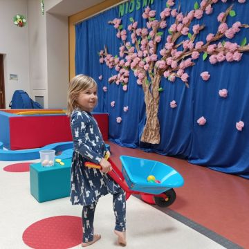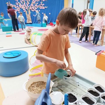 W dniu 20 marca 2026 roku w Naszym Przedszkolu odbyły się zajęcia sensoryczno – motoryczne pod nazwą „Wiosenne prace w ogrodzie”. Celem tych zajęć była stymulacja polisensoryczna, czyli dostarczanie różnorodnych bodźców sensorycznych: wzrokowych, słuchowych, dotykowych, proprioceptywnych, węchowych oraz planowania motorycznego, aby pobudzić zmysły, rozwinąć percepcje oraz umiejętności poznawcze. Zajęcia były dostosowane do potrzeb i możliwości dziecka w wieku przedszkolnym. Wprowadzeniem do zajęć była krótka opowieść o wiosennych pracach w ogrodzie, o tym jakie narzędzia są wykorzystywane do prac na działce. Przedszkolaki wzbogaciły swoją wiedzę na temat przedmiotów wykorzystywanych w ogródku. Dzieci wiedzą do czego służą: grabie, łopata, widły, pazurki, picownik, taczki; wiedzą także co to jest kompostownik. Poznały także owady, które pomagają użyźniać glebę oraz gryzonie, które niszczą nasze roślinki. Dzieci uczyły się poprzez przygotowane różne doświadczenia i zabawy, a proponowane aktywności sprawiały, że stymulowane były zmysły: wzroku (omijanie napotkanych przeszkód, wyszukiwanie króliczków w pszenicy z wykorzystaniem szczypiec trójpalcowych, wybieranie piłeczek sensorycznych z fasoli, wyszukiwanie kamyków w kaszy gryczanej z użyciem szczypiec, ozdabianie doniczek naklejkami, wysiewanie rzeżuchy na wacie oraz owsa w ziemi, zabawa sprężynką, uzupełnianie mozaiki, wykonywanie obrazka z użyciem sznurówek według wzoru i według swojego pomysłu, przewożenie piłeczek na taczkach z punktu A do punktu B, przenoszenie jajek na łyżce po torze w kształcie dżdżownicy, stymulacja wzroku z użyciem płyty z kulkami – przetaczanie ósemek); słuchu: (słuchanie opowiadania o tematyce „wiosenne prace w ogrodzie”, słuchanie w tle odgłosów ptaków); dotyku: (przewożenie piłeczek na taczkach, wyszukiwanie piłeczek sensorycznych w masach sypkich, wykorzystywanie różnego rodzaju szczypiec podczas wyszukiwania drobnych przedmiotów w masach sypkich, chodzenie po tematycznej ścieżce sensorycznej, pokonywanie toru przeszkód o zmiennych wysokościach z przenoszeniem przedmiotów, oglądanie książeczki sensorycznej o tematyce pogoda – książeczka dotykowa z wypukłymi elementami pogody wiosennej, wykonywanie mozaiki z użyciem pinesek, sznurówek i przyrządów do przewlekania, wysiewanie rzeżuchy na wacie, ozdabianie pojemników naklejkami, rozpoznawanie kory drzew: tuja, brzoza, sosna, zakładanie rękawiczek ogrodniczych, wykonywanie ruchów grabiami, miotłą oraz łopatką, nasypywanie ziemi do doniczek i wysiewanie owsa); węchu: (rozpoznawanie zapachów: tulipan, lilia, tuja, rzeżucha, sosna, brzoza); planowania motorycznego: (pokonywanie złożonego toru przeszkód, chodzenie ze zmianą pozycji); propriocepcji: (chodzenie na czworakach w tunelu).